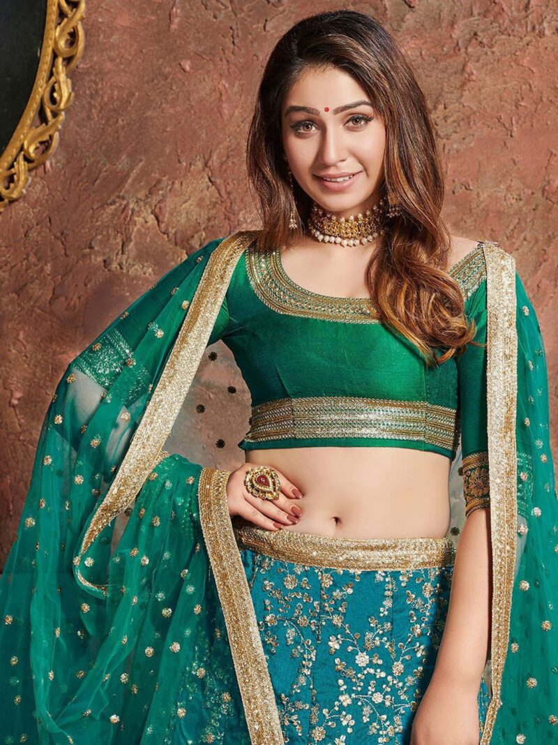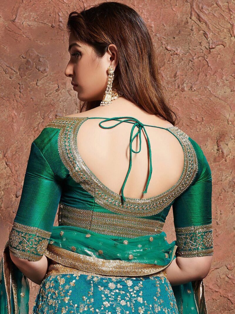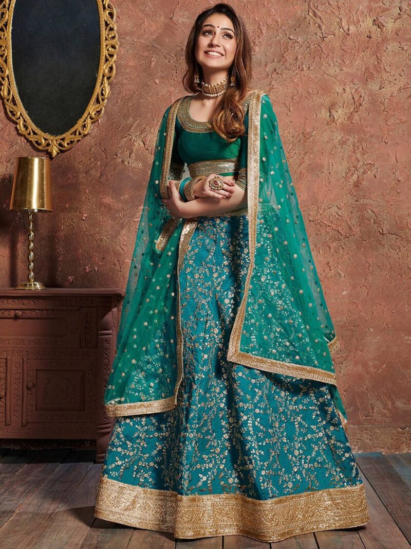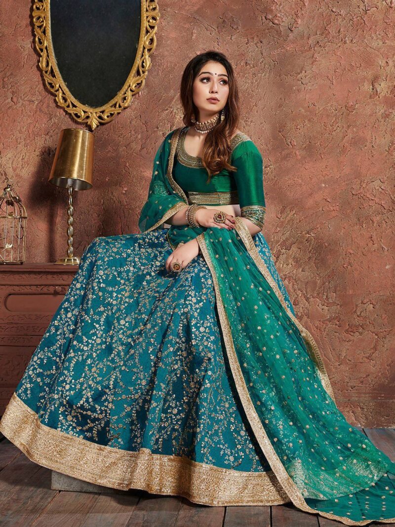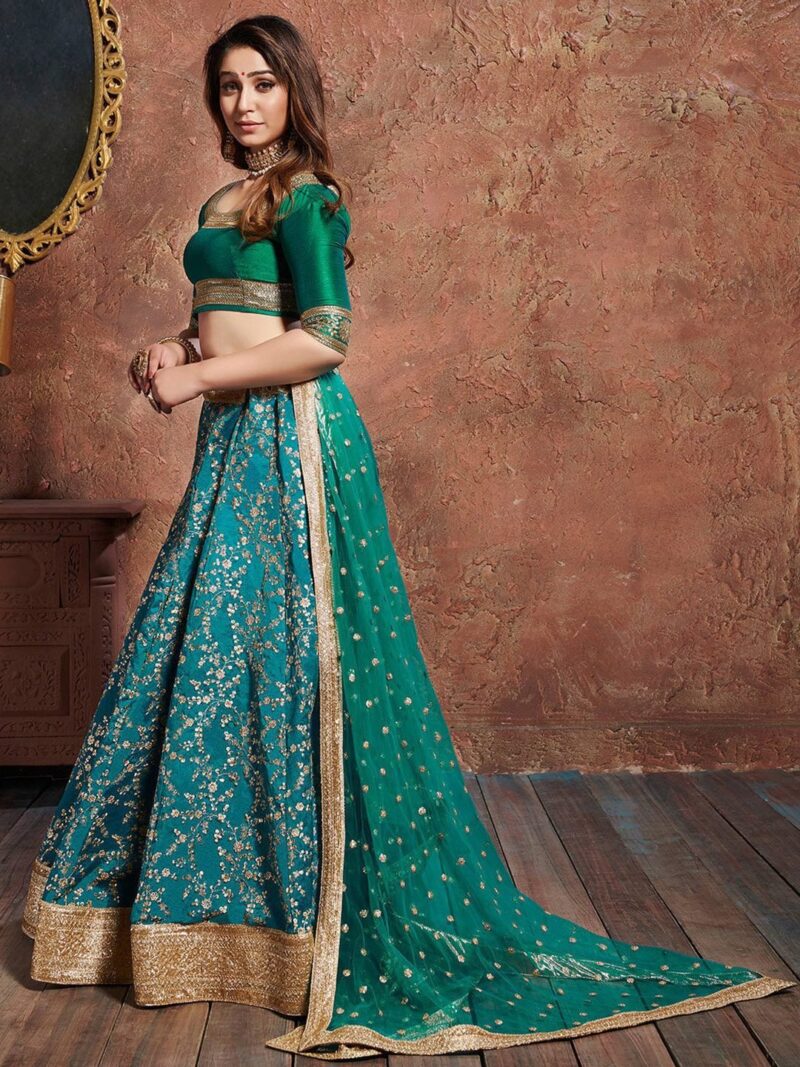 Turquoise blue and gold-toned embroidered lehenga choli with dupatta, zari