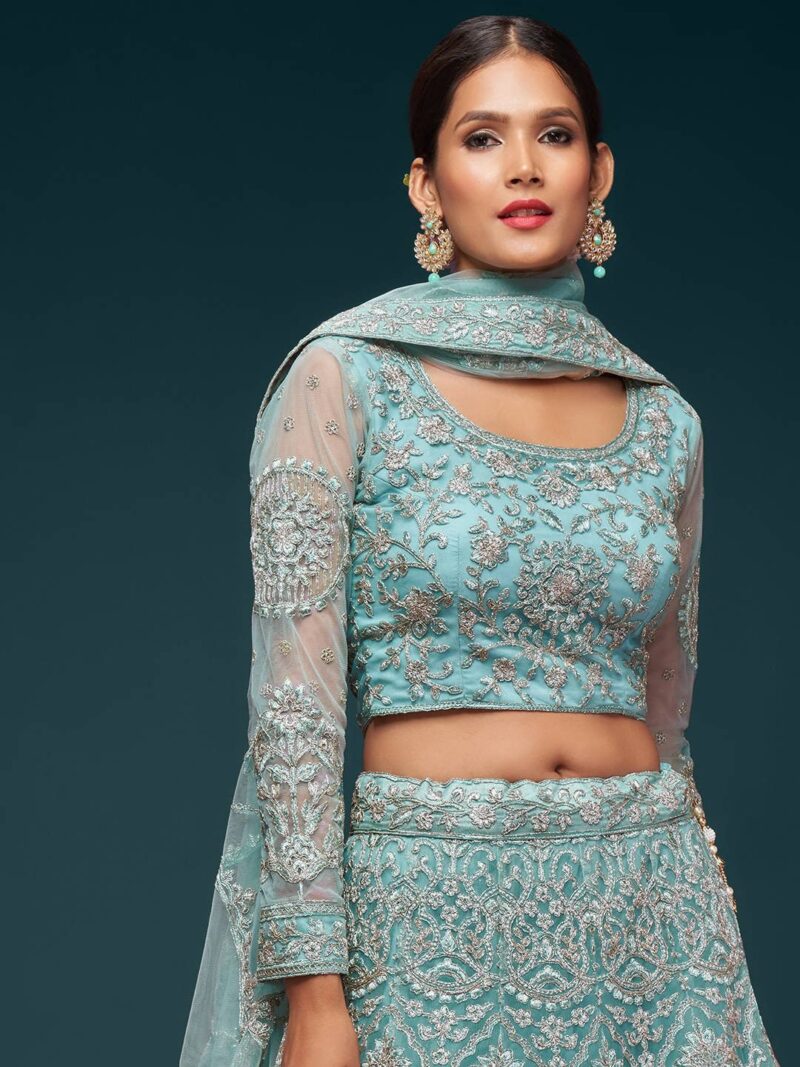 Turquoise blue and silver-toned embroidered lehenga choli with dupatta, thread work