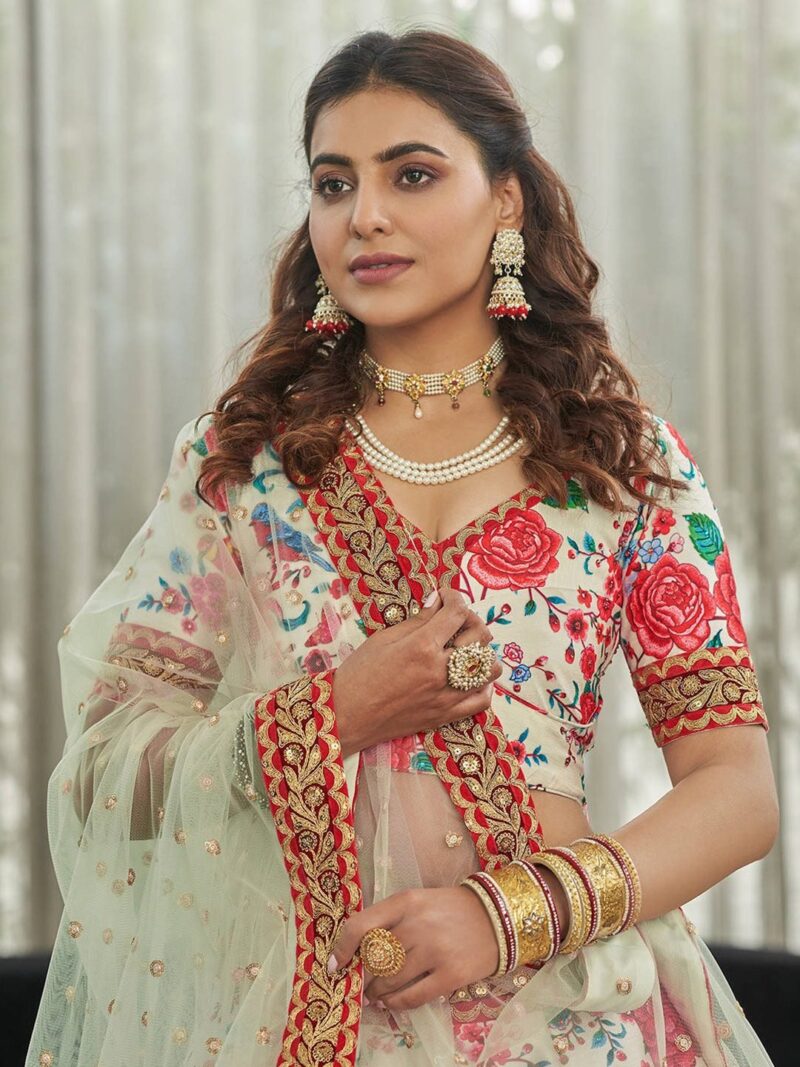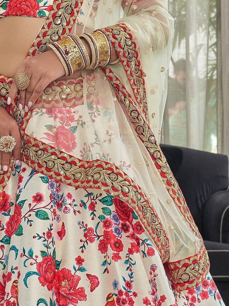 White and red printed lehenga choli with dupatta, beads and stones