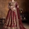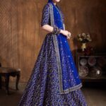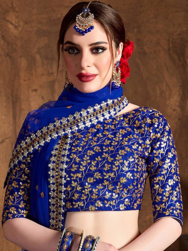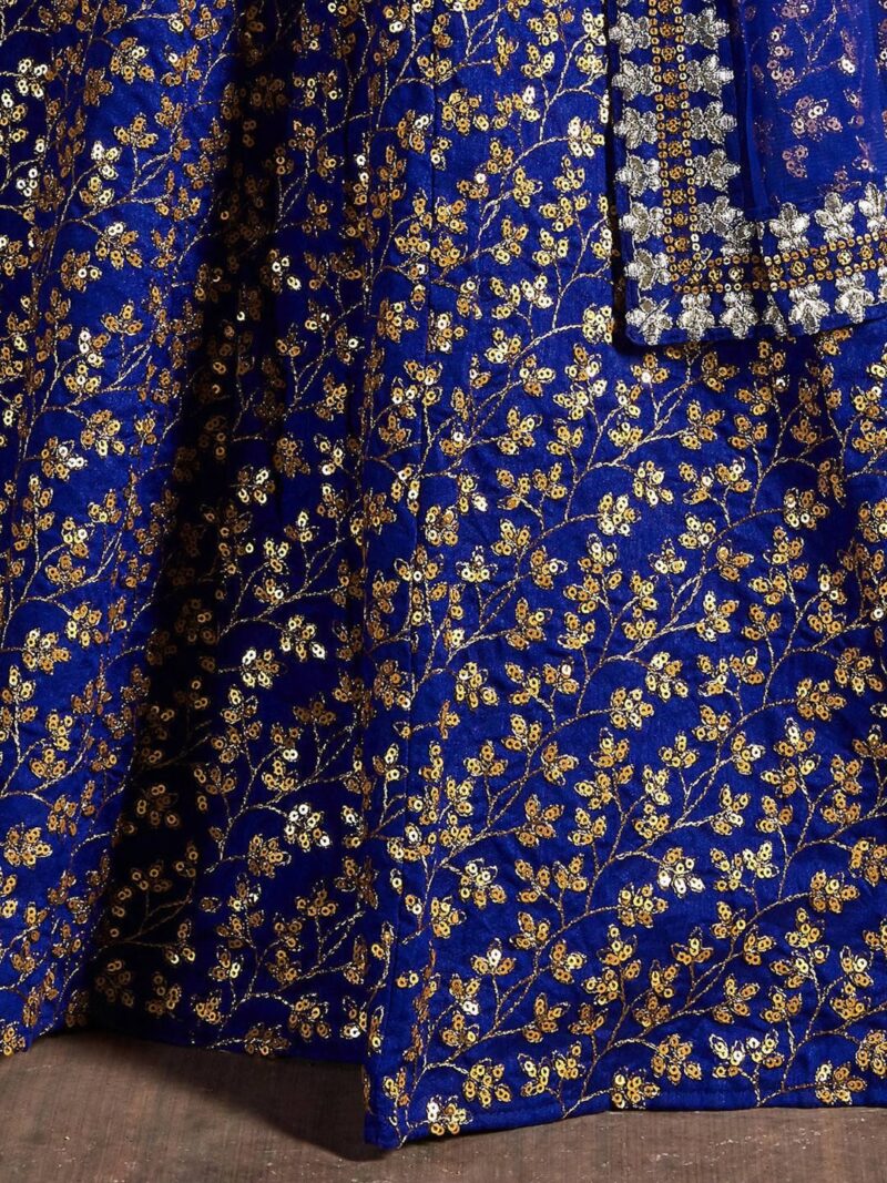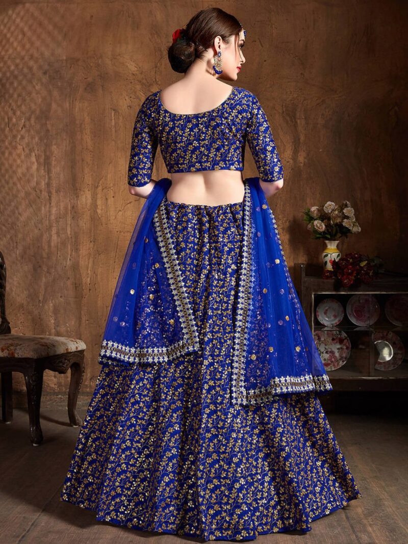 Blue and gold-toned embroidered lehenga choli with dupatta, thread work