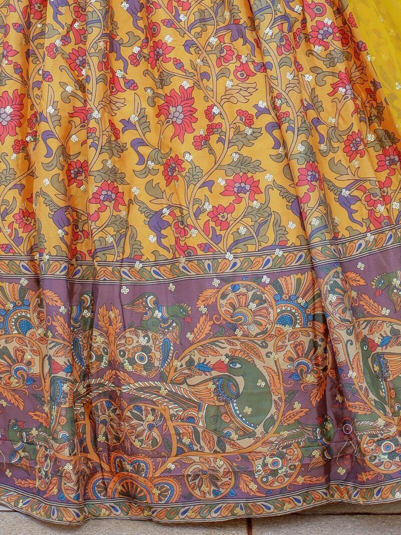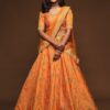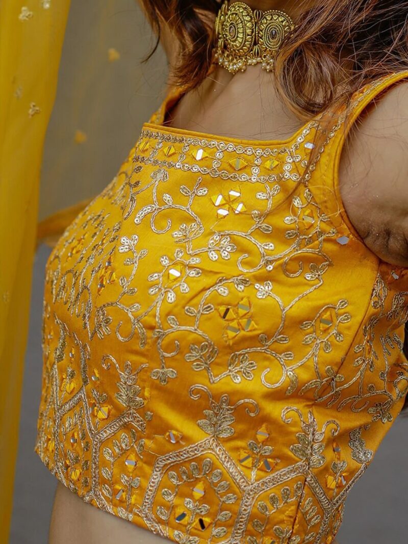 Yellow and green embellished unstitched blouse, has a square neck, sleeveless, yellow and green printed semi-stitched lehenga, flared hem