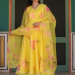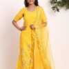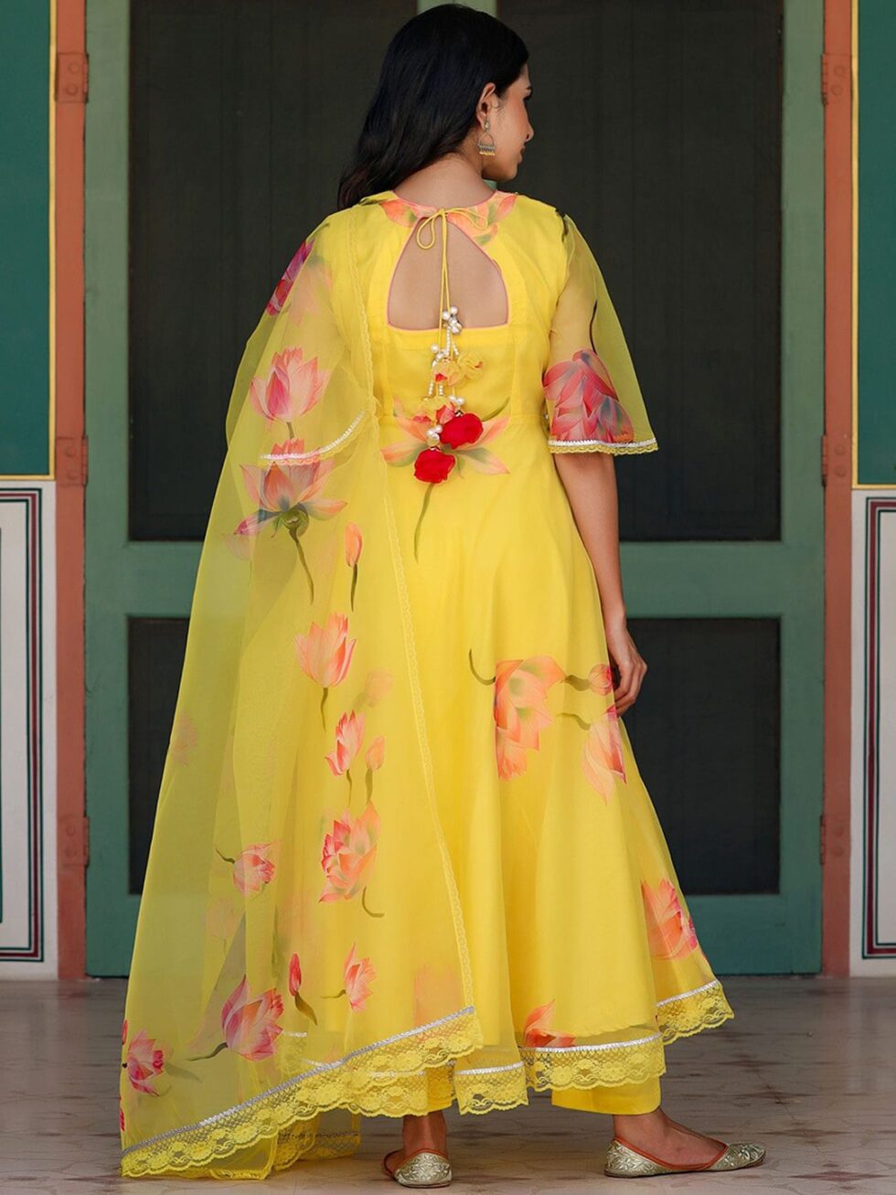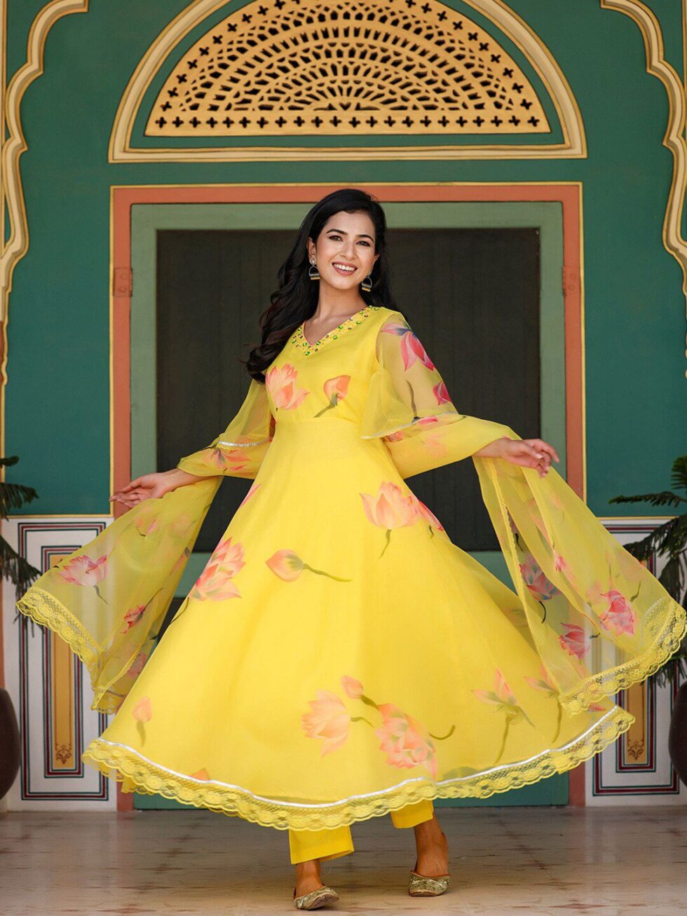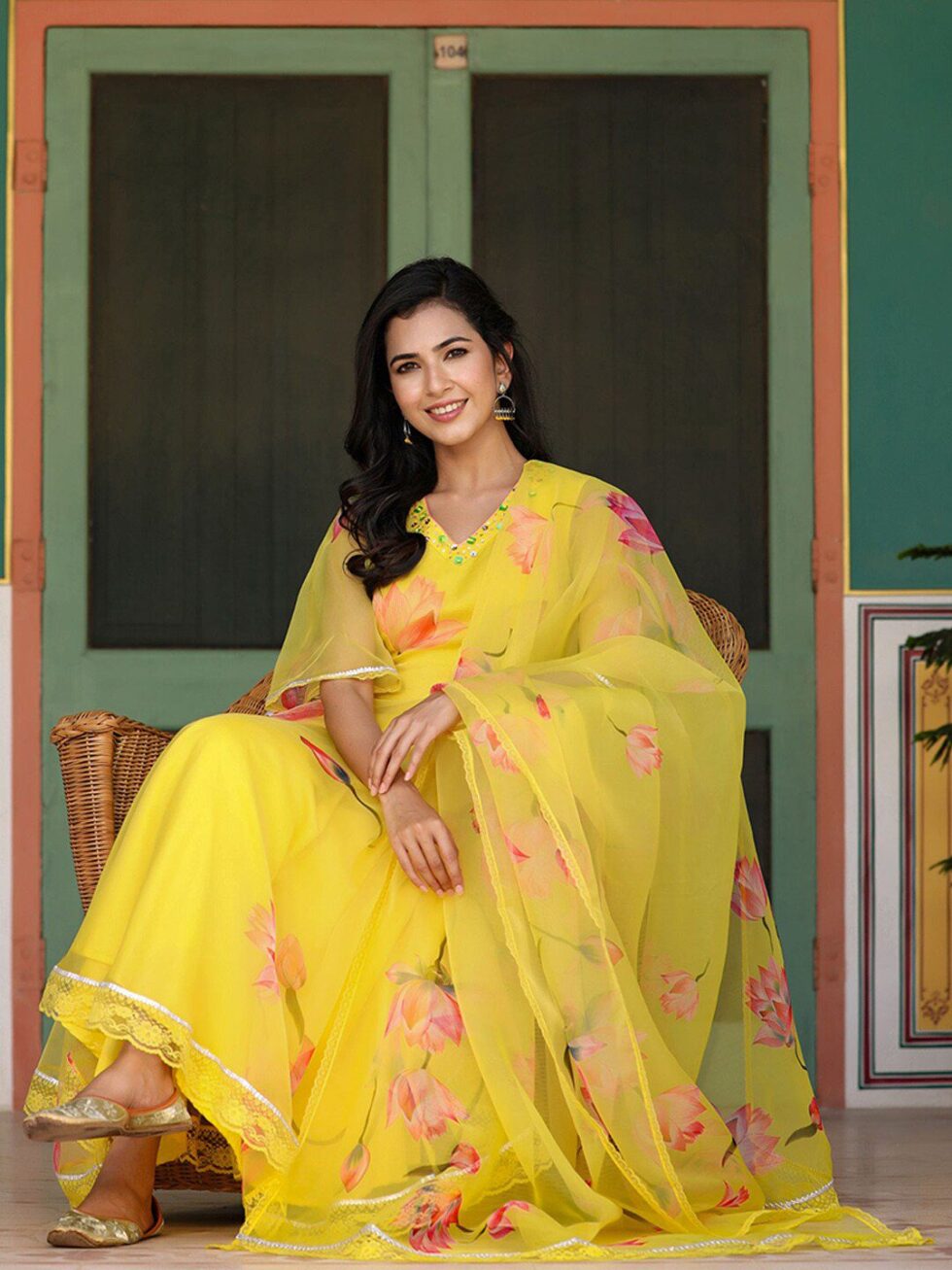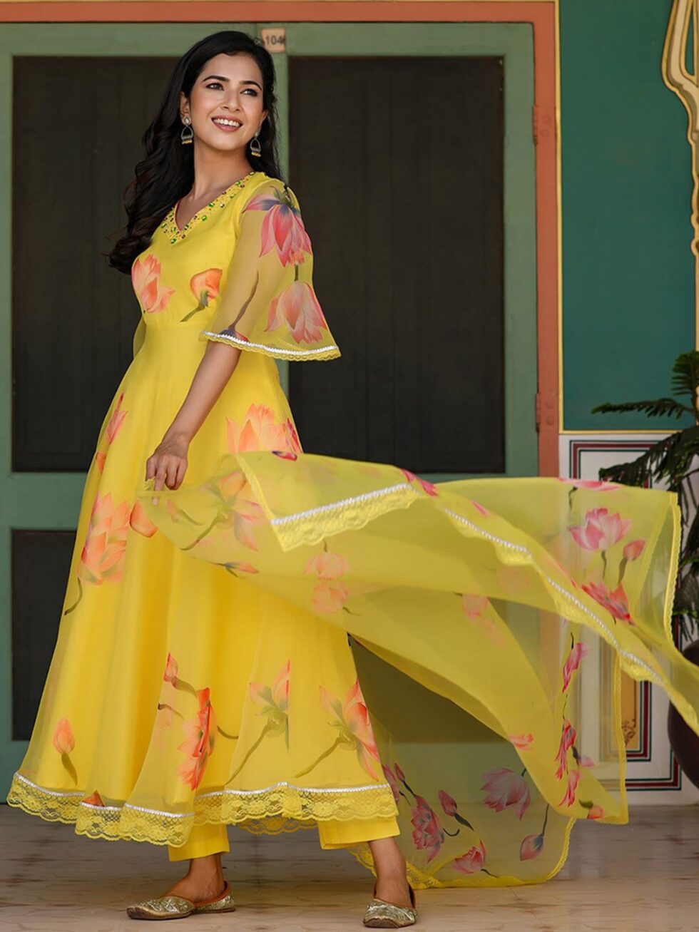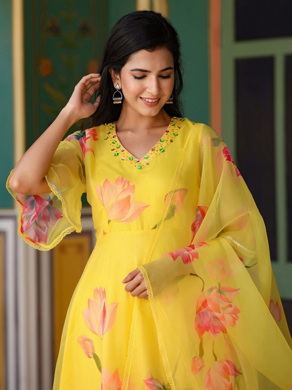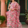 GILLORI Floral Printed Bead Work Organza Kurta with Trousers & Dupatta