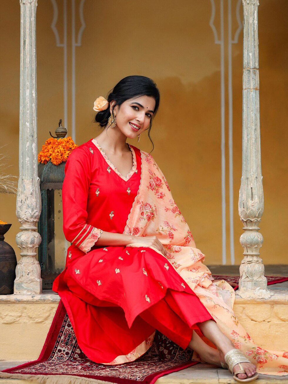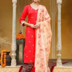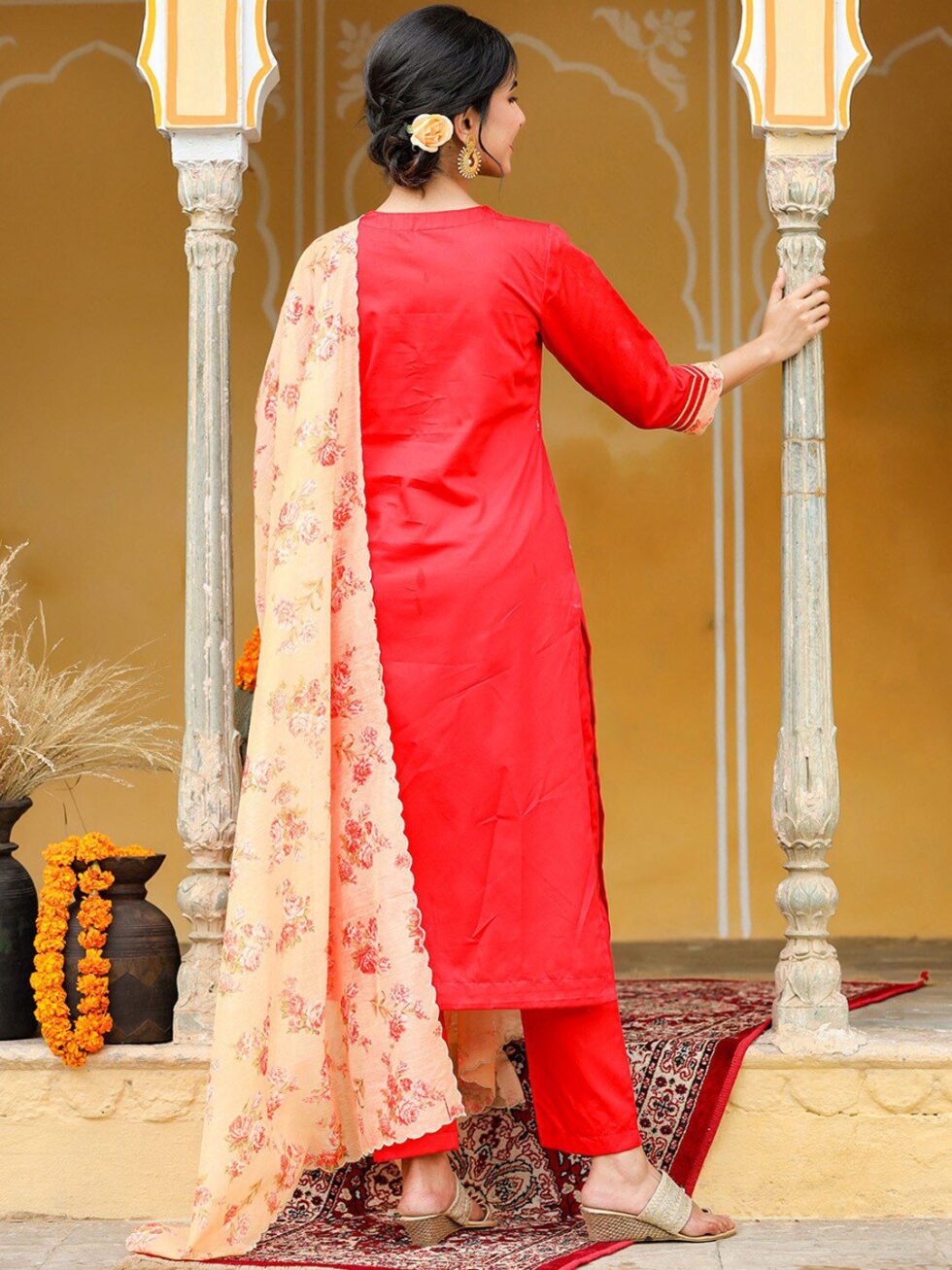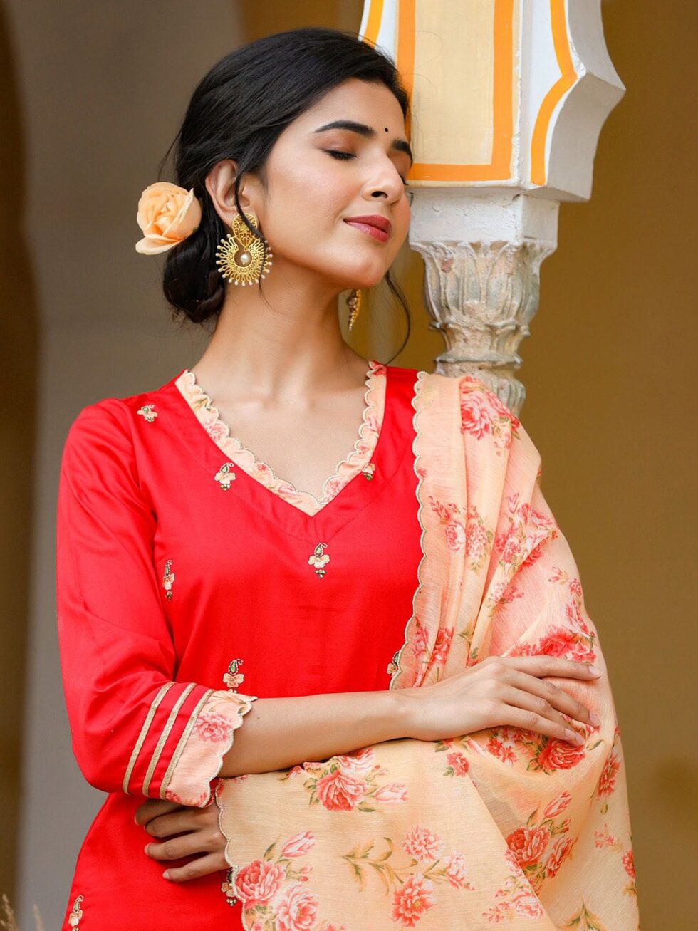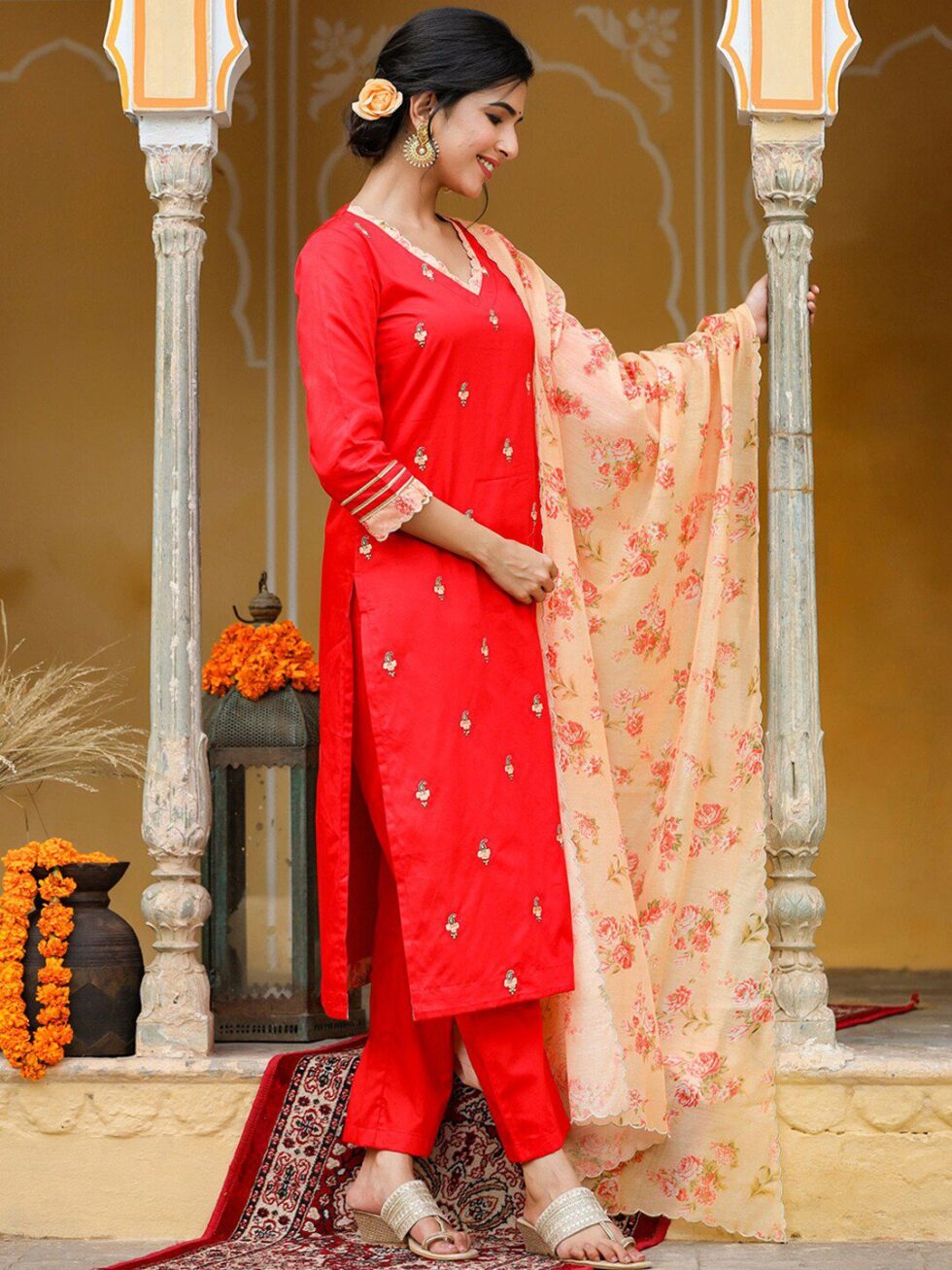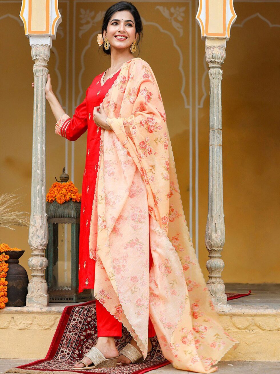 GILLORI Floral Printed V-Neck Thread Work Kurta with Trousers & Dupatta
