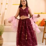 Burgundy and gold-toned embellished lehenga choli with dupatta, thread work