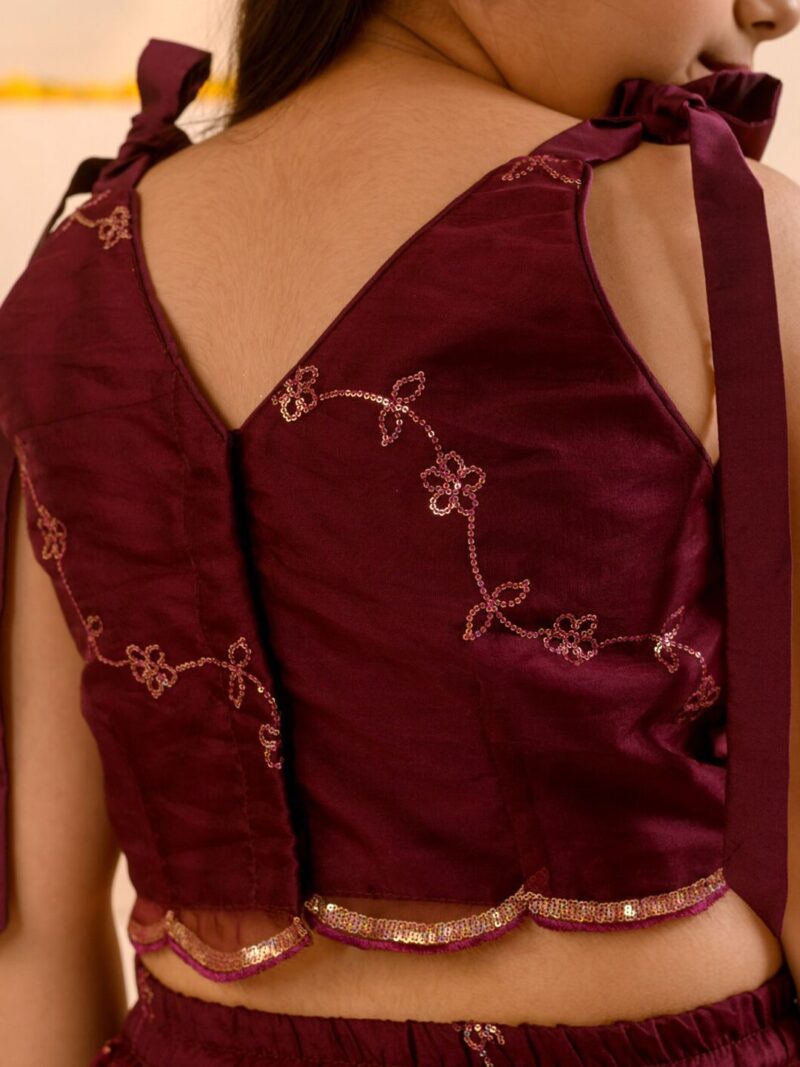 Burgundy and gold-toned embellished ready to wear blouse, has a v-neck, sleeveless, slip-on closure