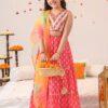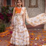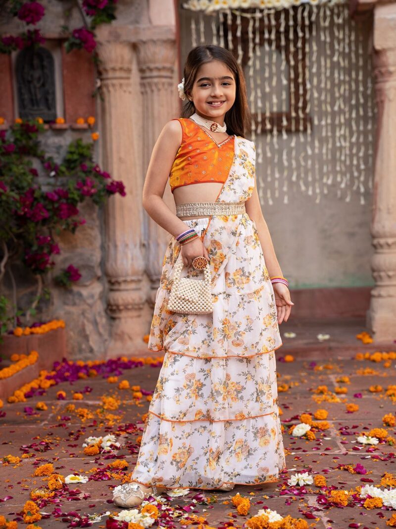 White and orange embellished ready to wear blouse, has a v-neck, sleeveless, white and orange printed ready to wear lehenga, has slip-on closure, flared hem