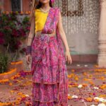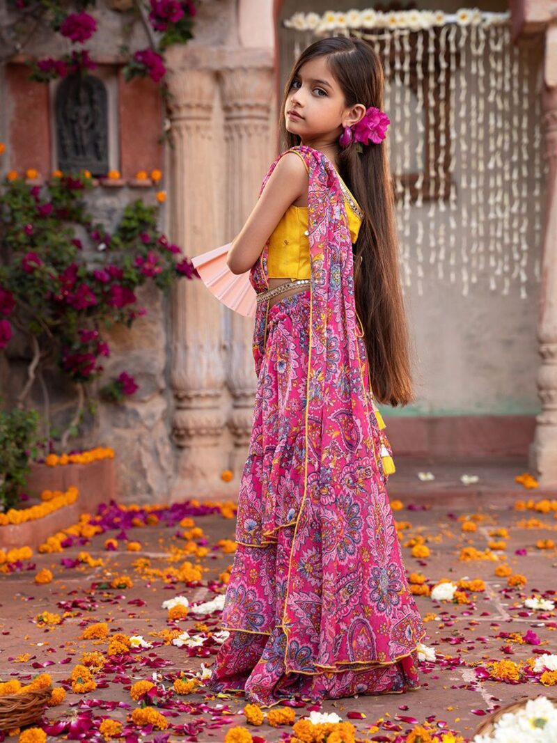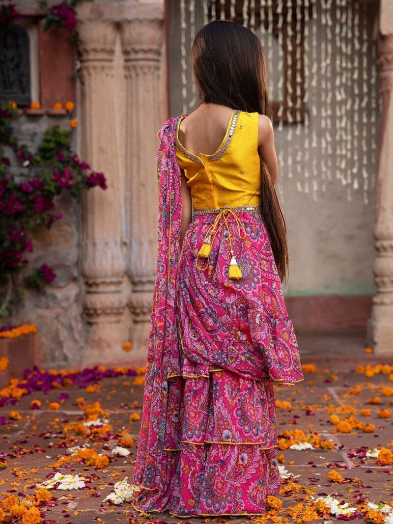 Yellow and magenta embroidered ready to wear blouse, has a v-neck, sleeveless, yellow and magenta printed ready to wear lehenga, has slip-on closure, flared hem