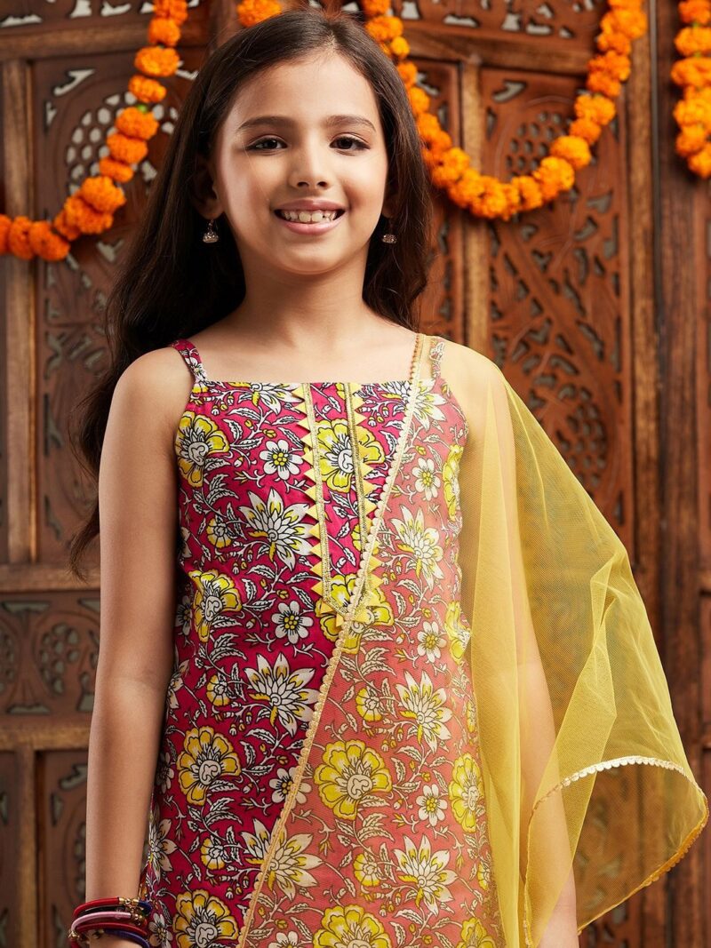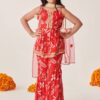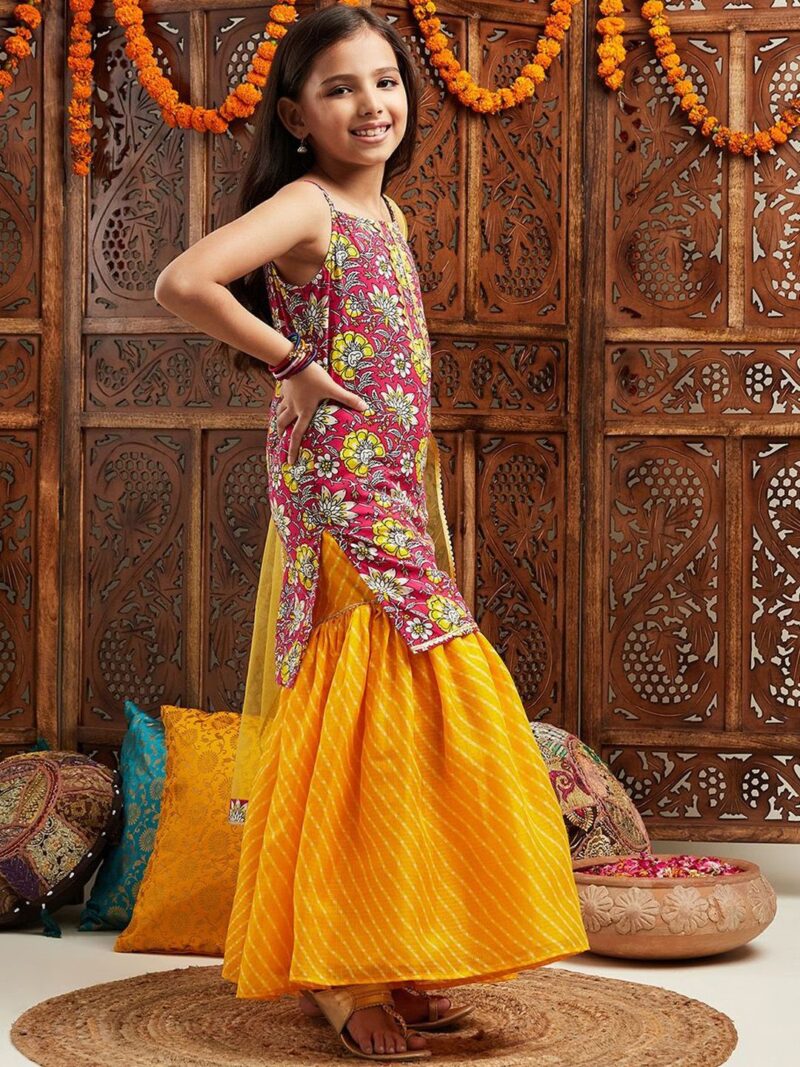 Magenta, yellow and white printed Kurti with Sharara with dupatta