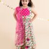 Pink and orange woven design ready to wear blouse, has a round neck, short sleeves, button closure