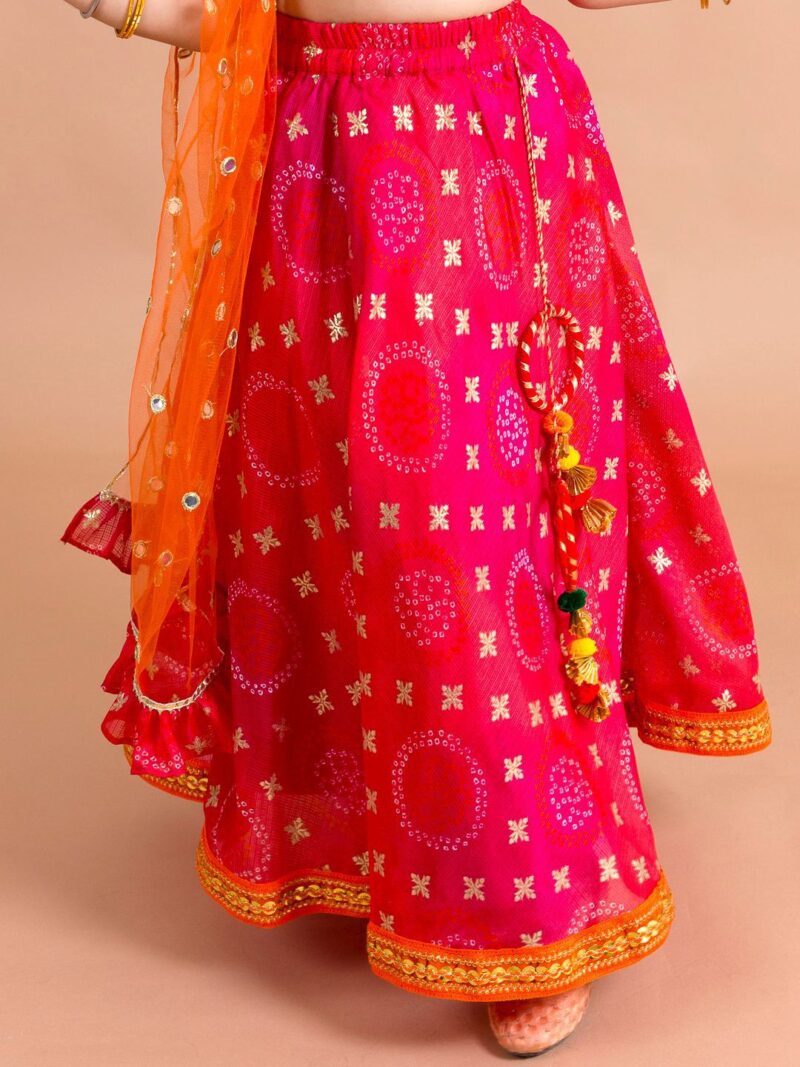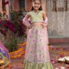 Pink and orange woven design ready to wear lehenga, has slip-on closure, flared hem