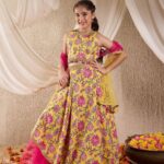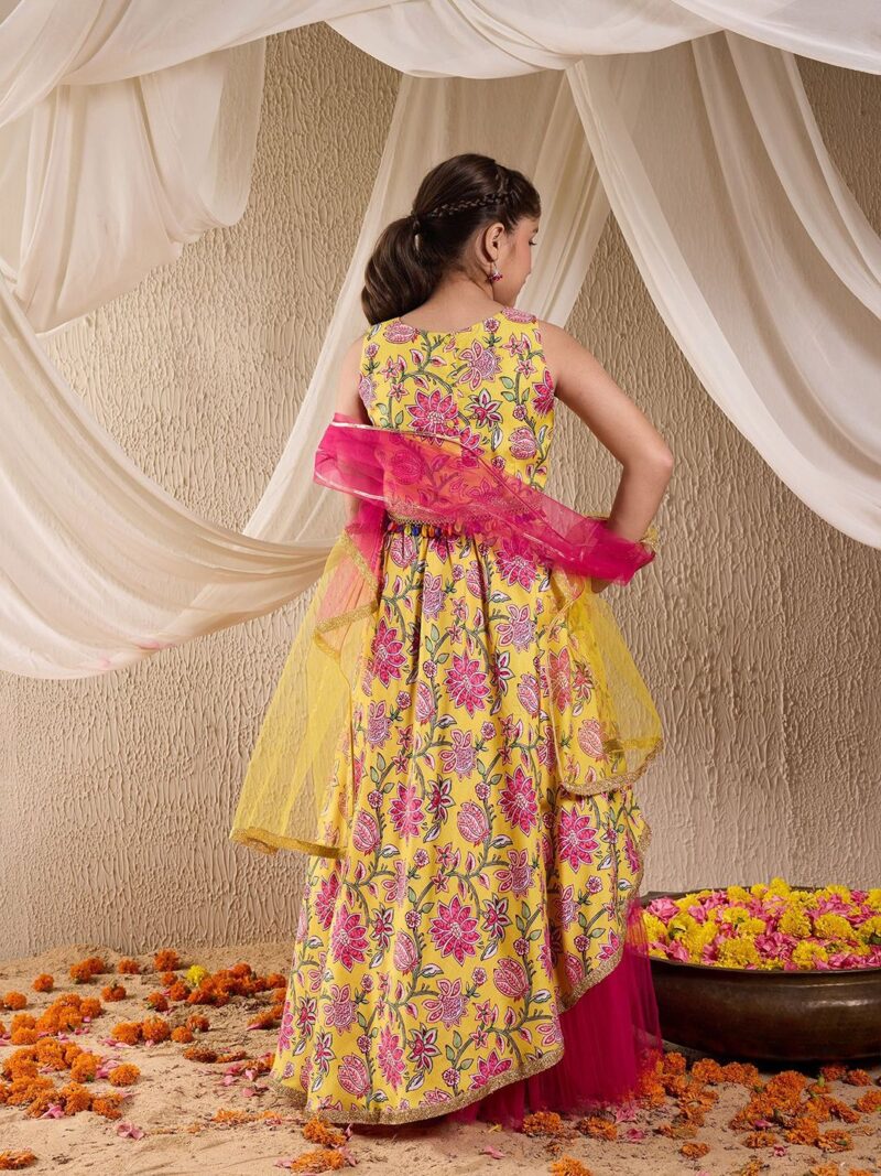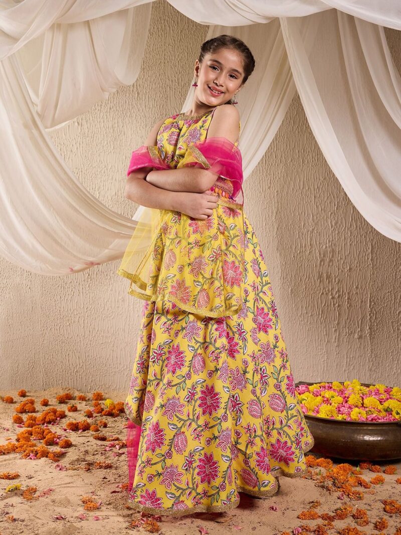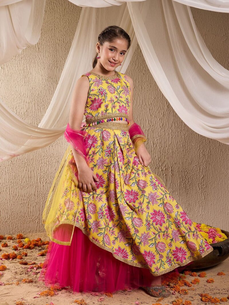 Yellow and pink, green printed lehenga choli with dupatta, Gotta Patti