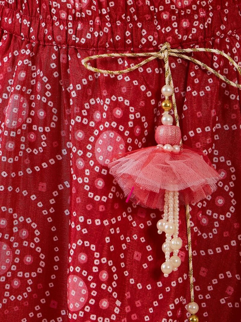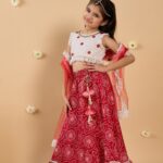 Red and white printed ready to wear blouse, has a round neck, sleeveless, red and white printed ready to wear lehenga, flared hem