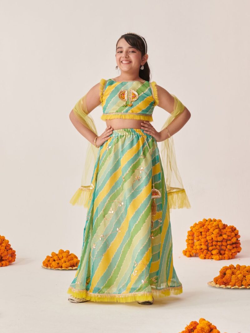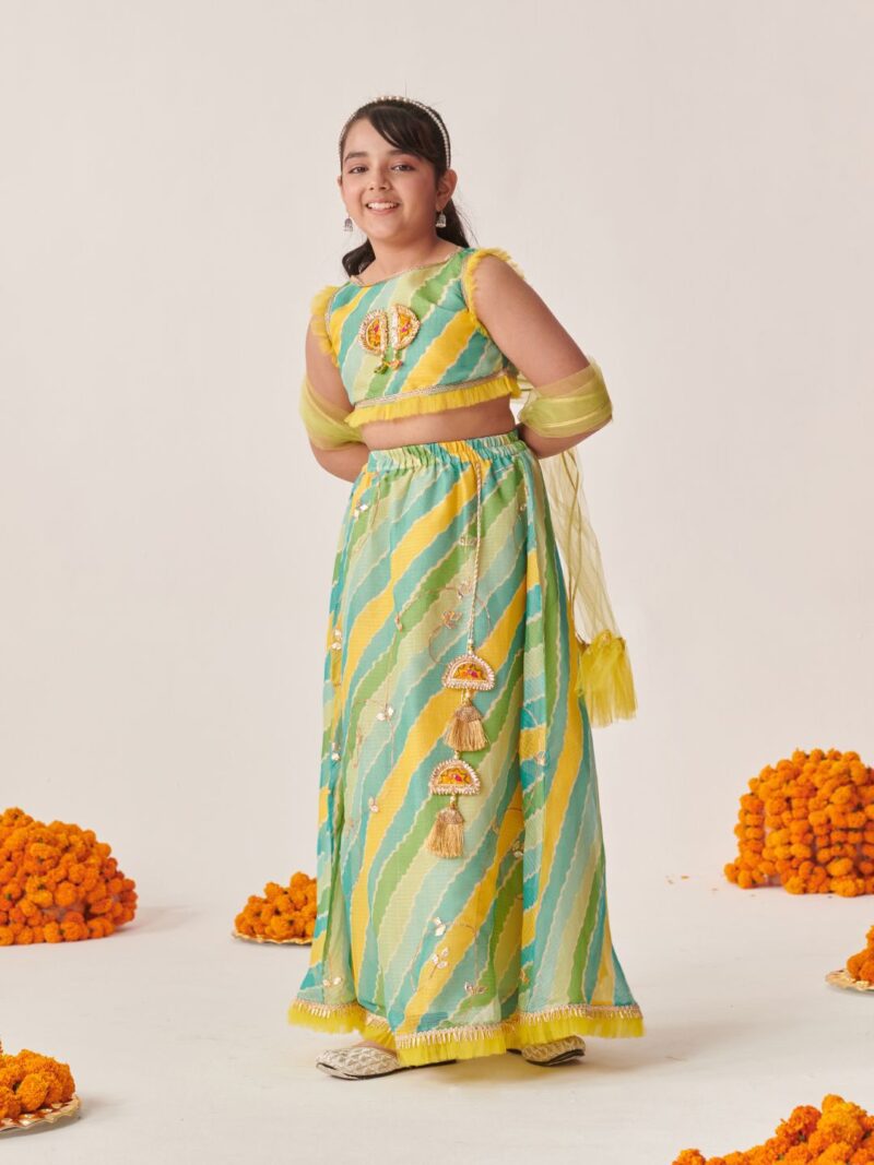 Green and yellow printed ready to wear lehenga, has slip-on closure, flared hem