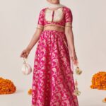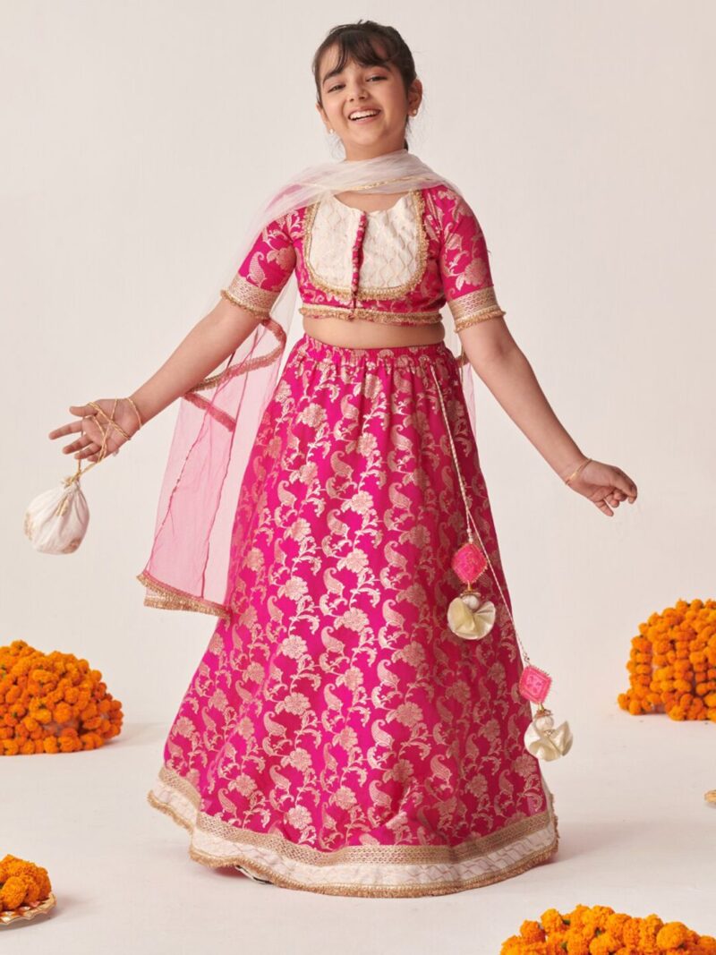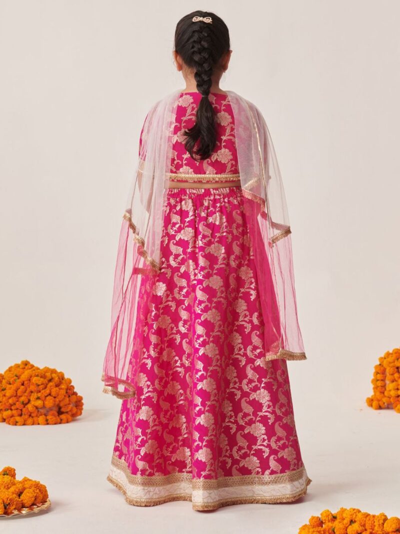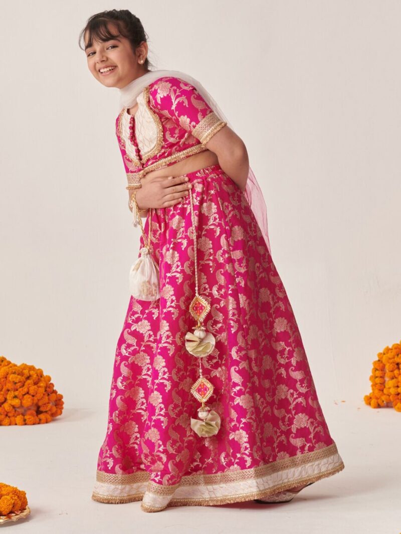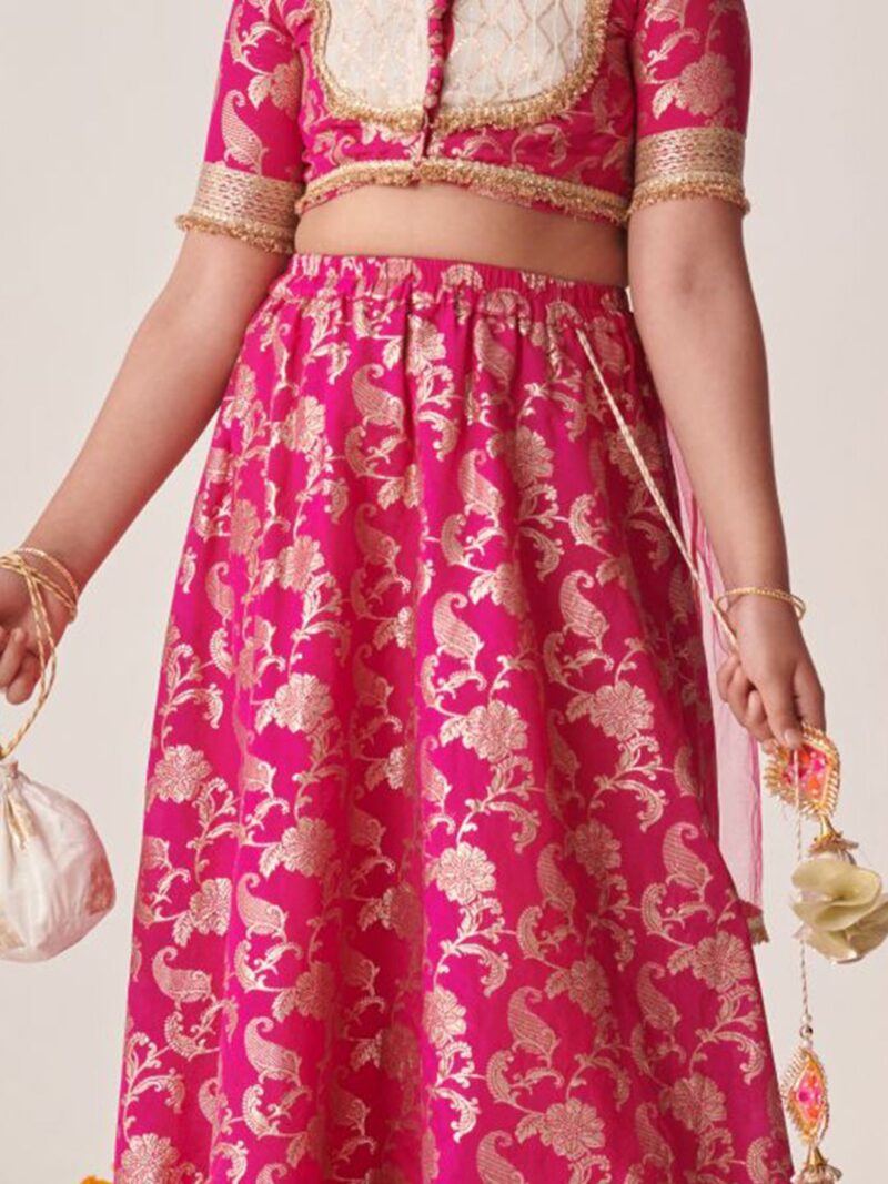 Magenta and gold-toned printed lehenga choli with dupatta,