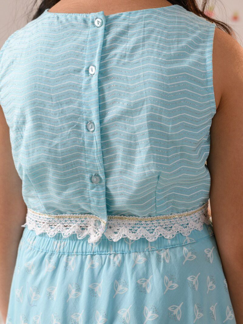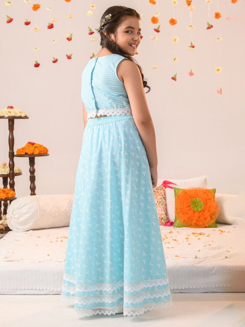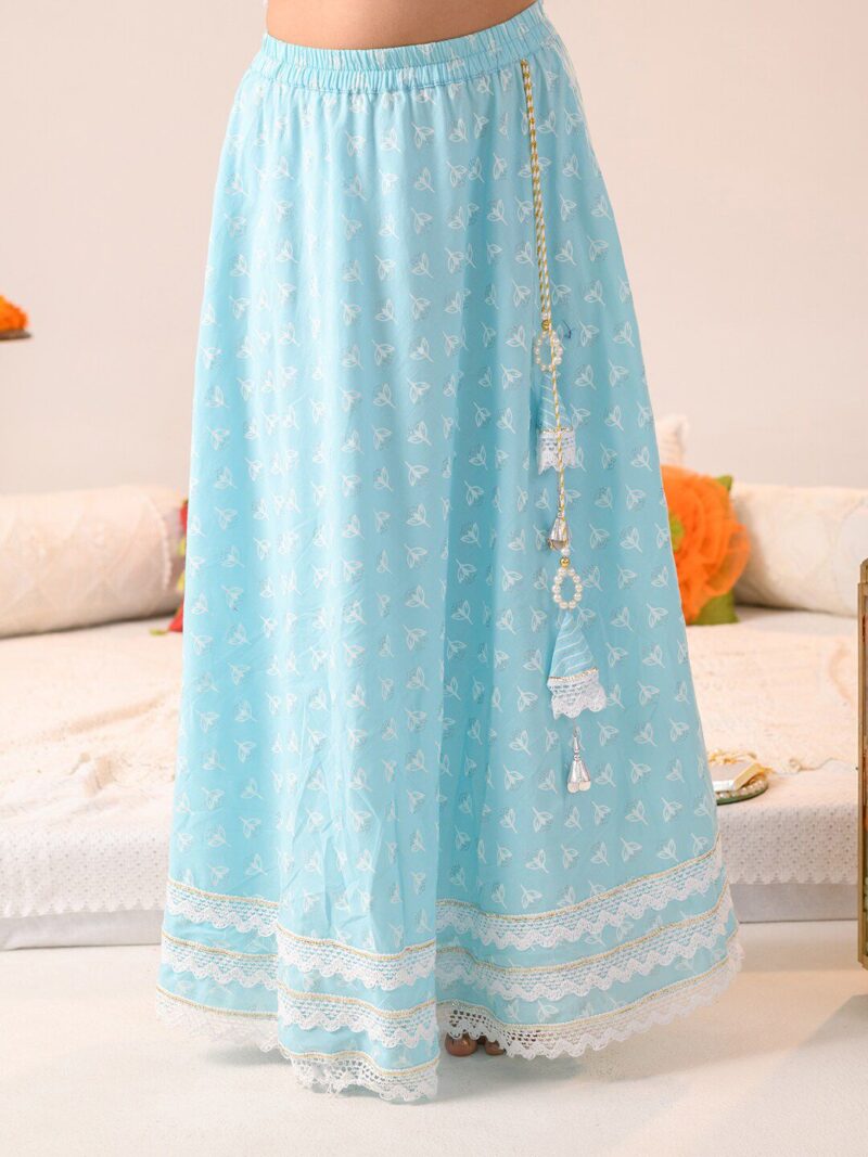 Blue and white printed ready to wear lehenga, has slip-on closure, flared hem
