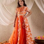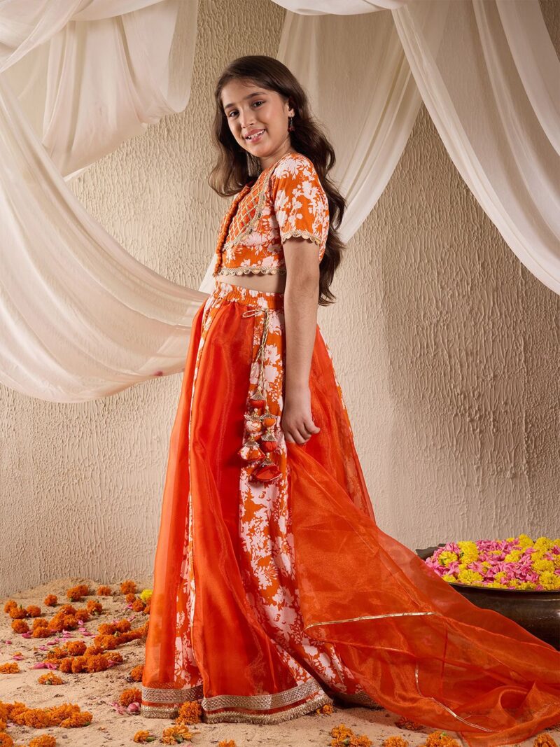 Orange and white printed lehenga choli with dupatta, gotta patti