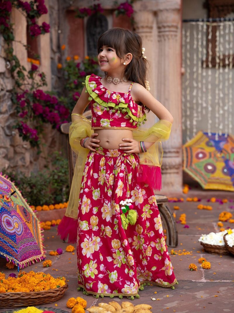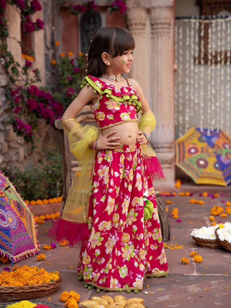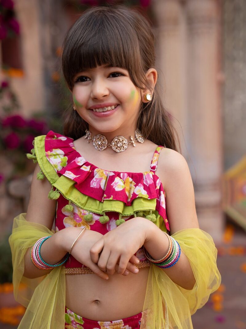 Pink and green printed ready to wear blouse, has a one shoulder, sleeveless, pink and green printed ready to wear lehenga, flared hem