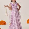 Olive green and pink printed ready to wear blouse, has a v-neck, sleeveless, olive green and pink printed ready to wear lehenga, has slip-on closure, flared hem