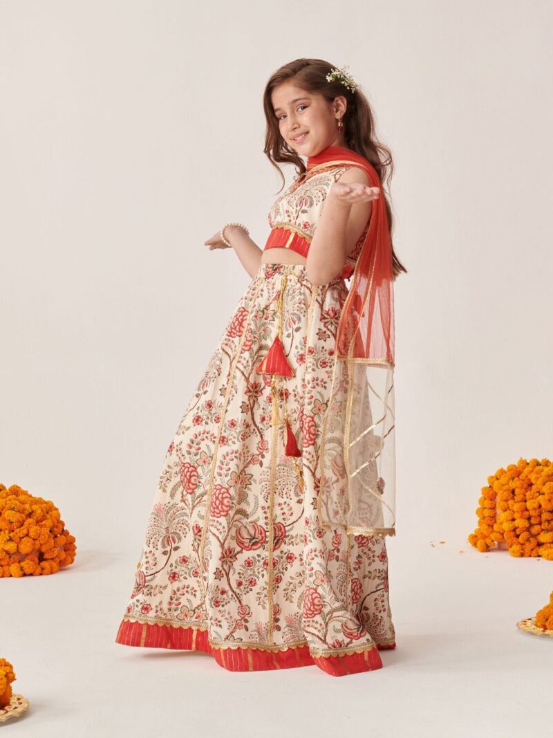 Off white and red printed ready to wear blouse, has a round neck, sleeveless, off white and red printed ready to wear lehenga, has slip-on closure, flared hem