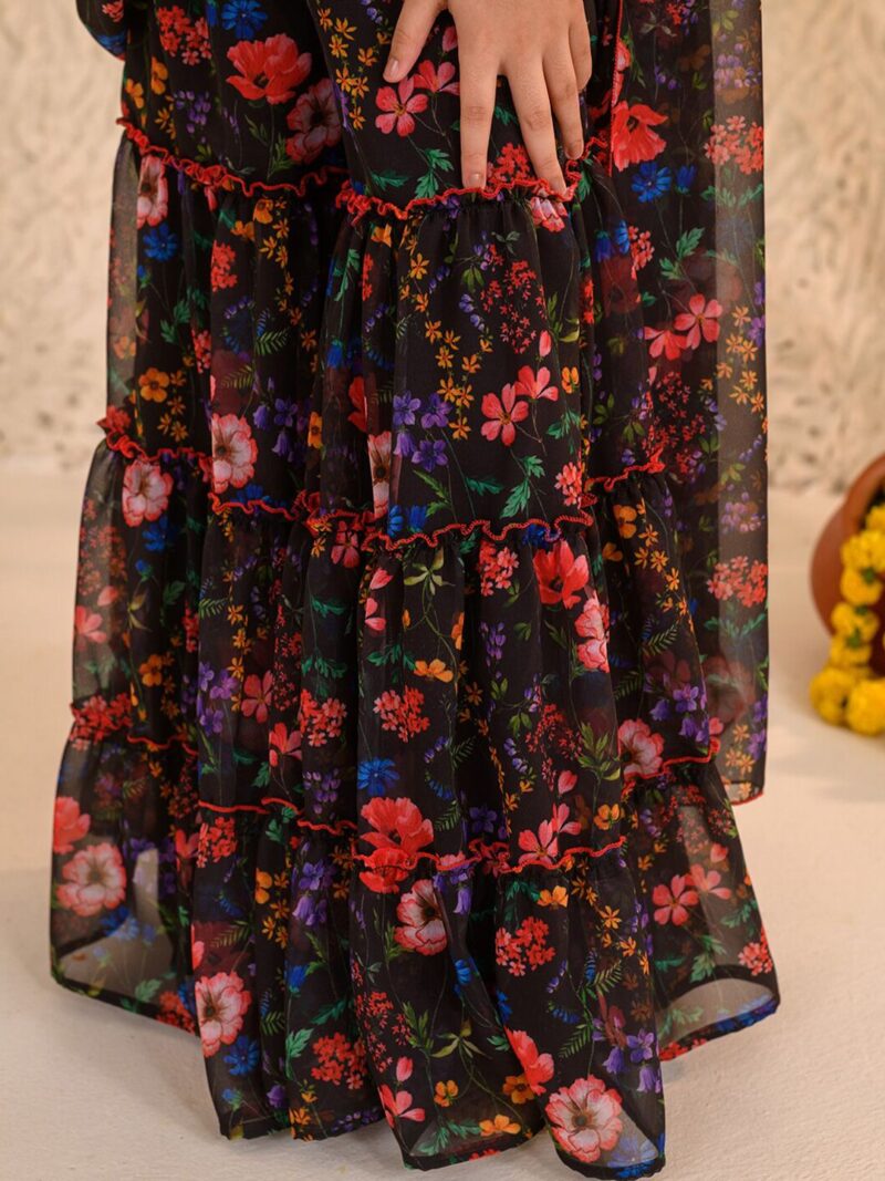 Black and red printed ready to wear lehenga, has slip-on closure, flared hem