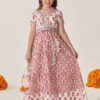 Purple and white printed ready to wear blouse, has a v-neck, sleeveless, slip-on closure