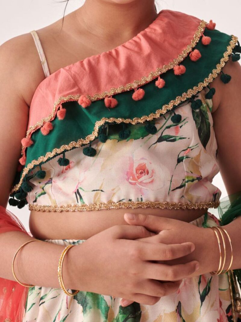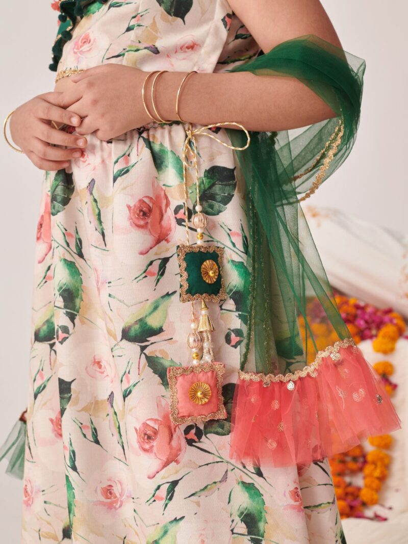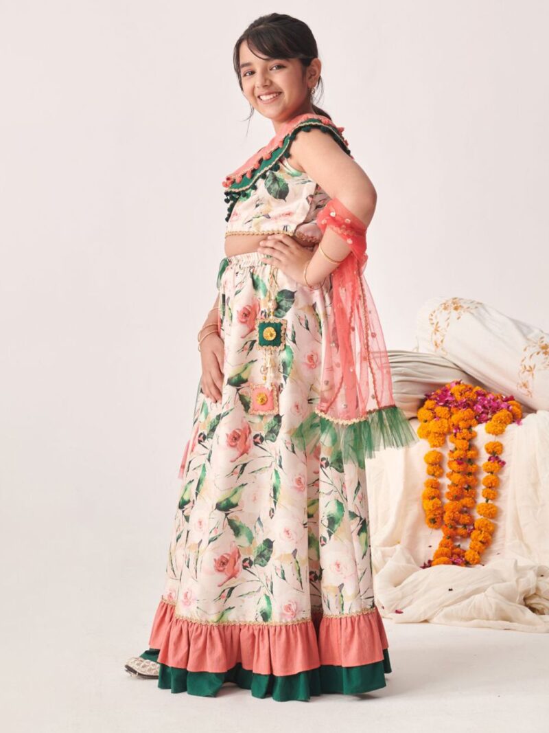 Peach-coloured and green printed lehenga choli with dupatta, thread work