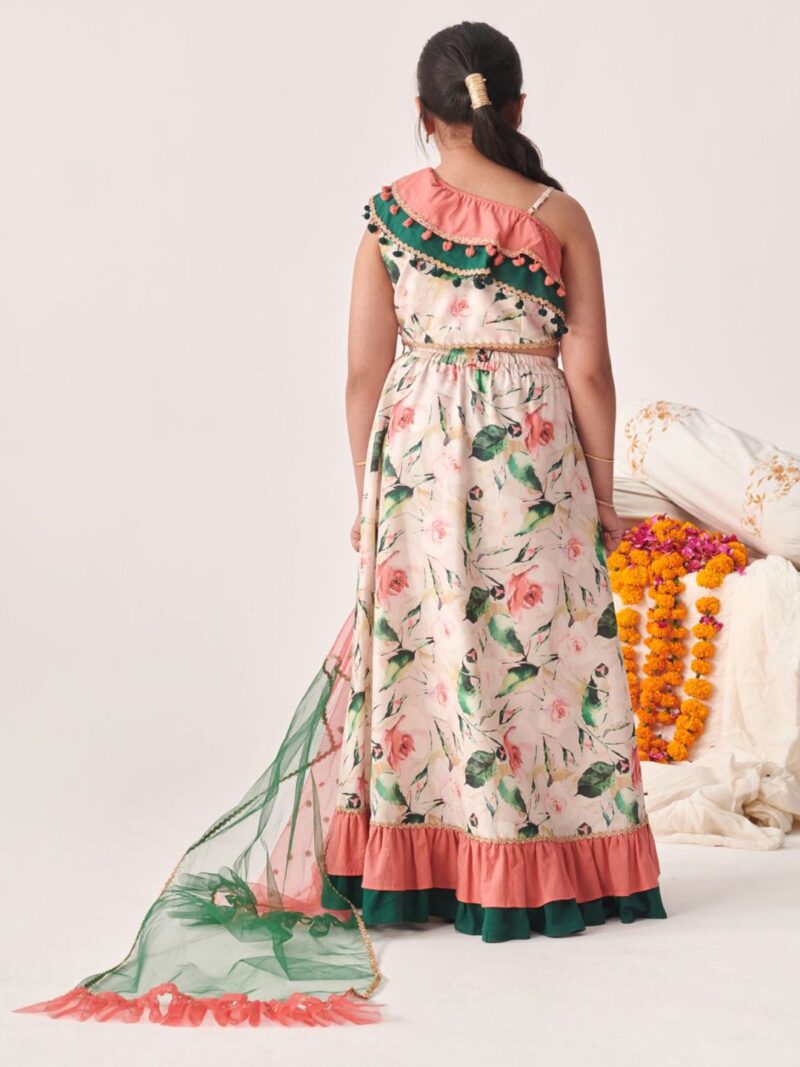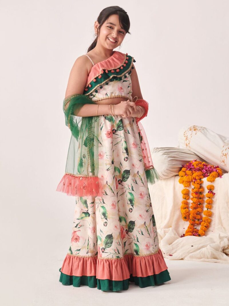 Peach-coloured and green printed ready to wear lehenga, has slip-on closure, flared hem