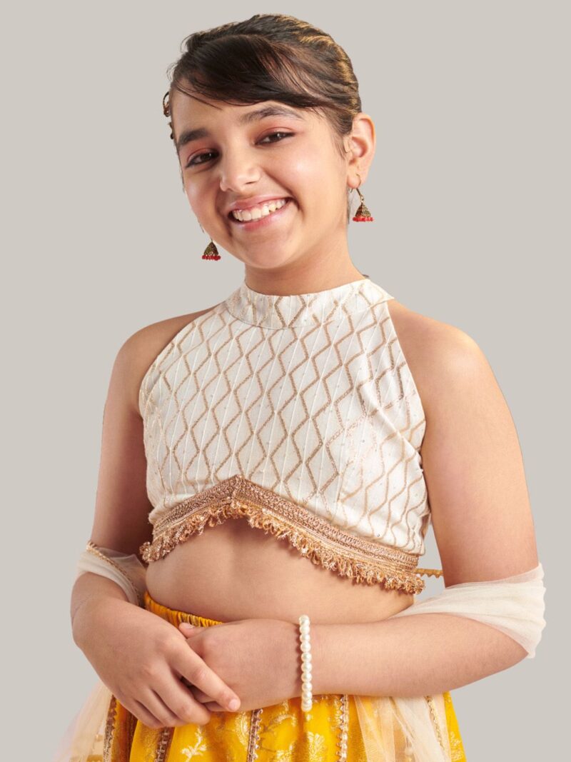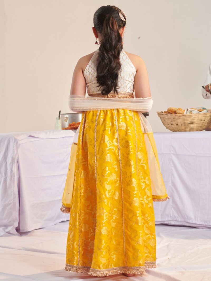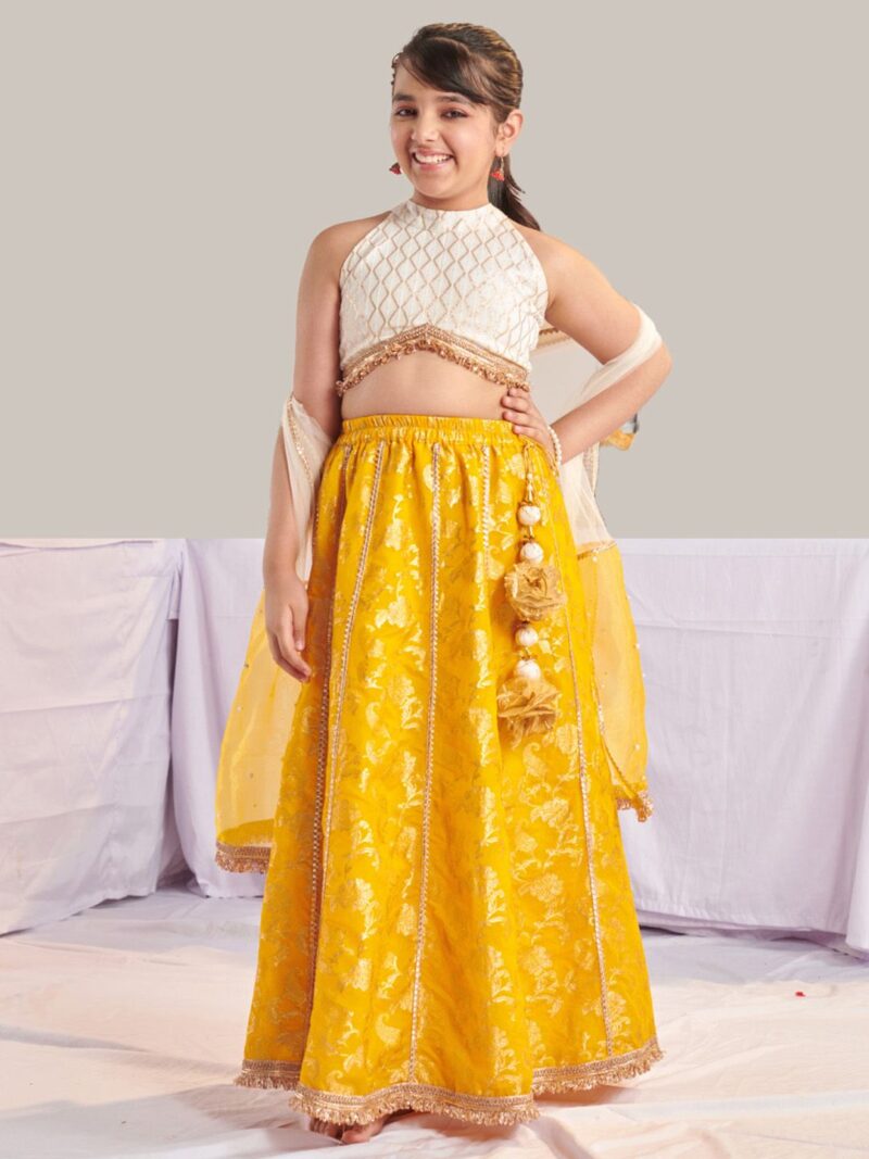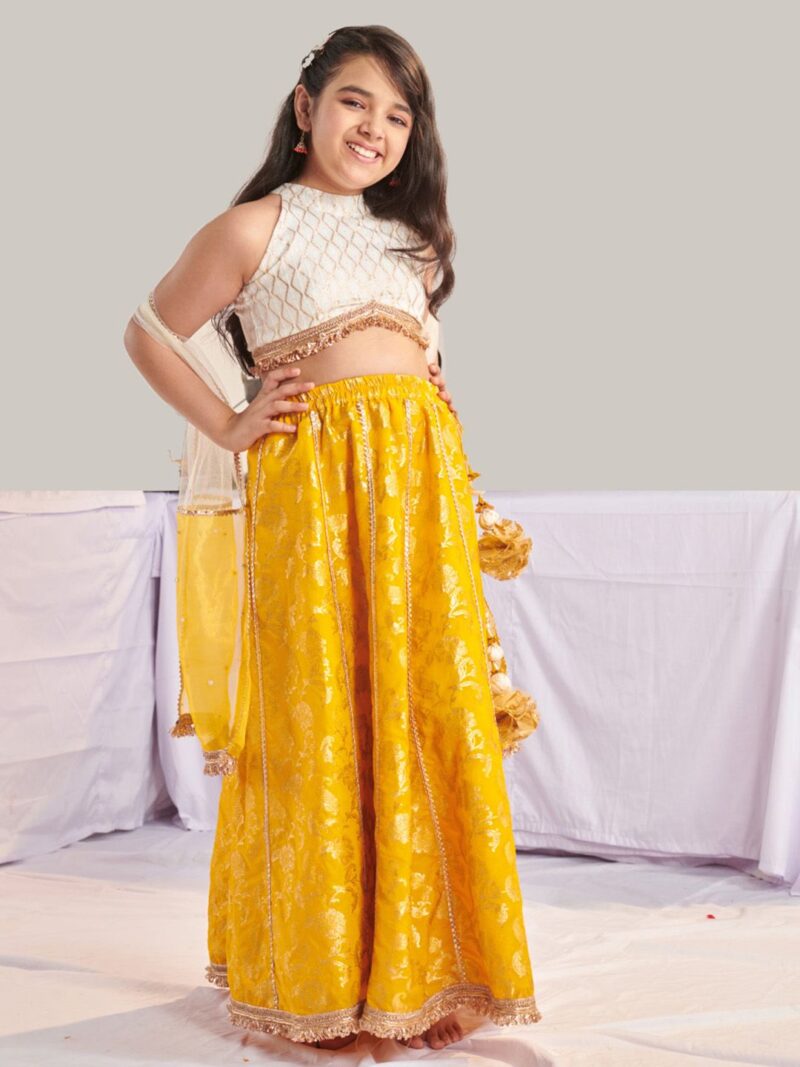 Yellow and white printed ready to wear lehenga, has slip-on closure, flared hem