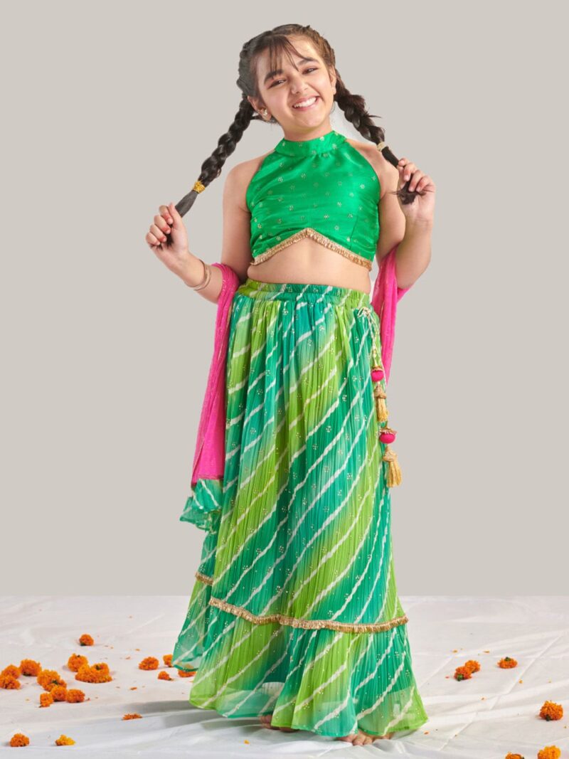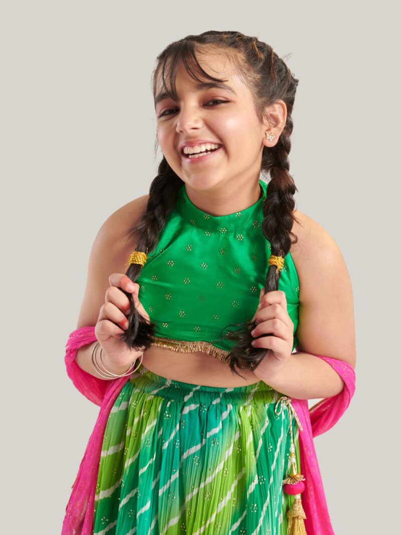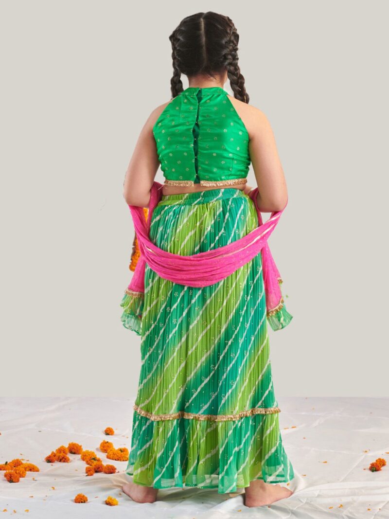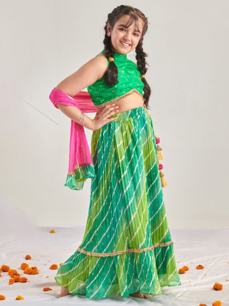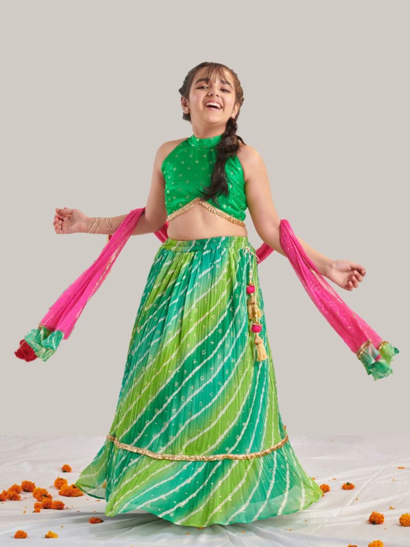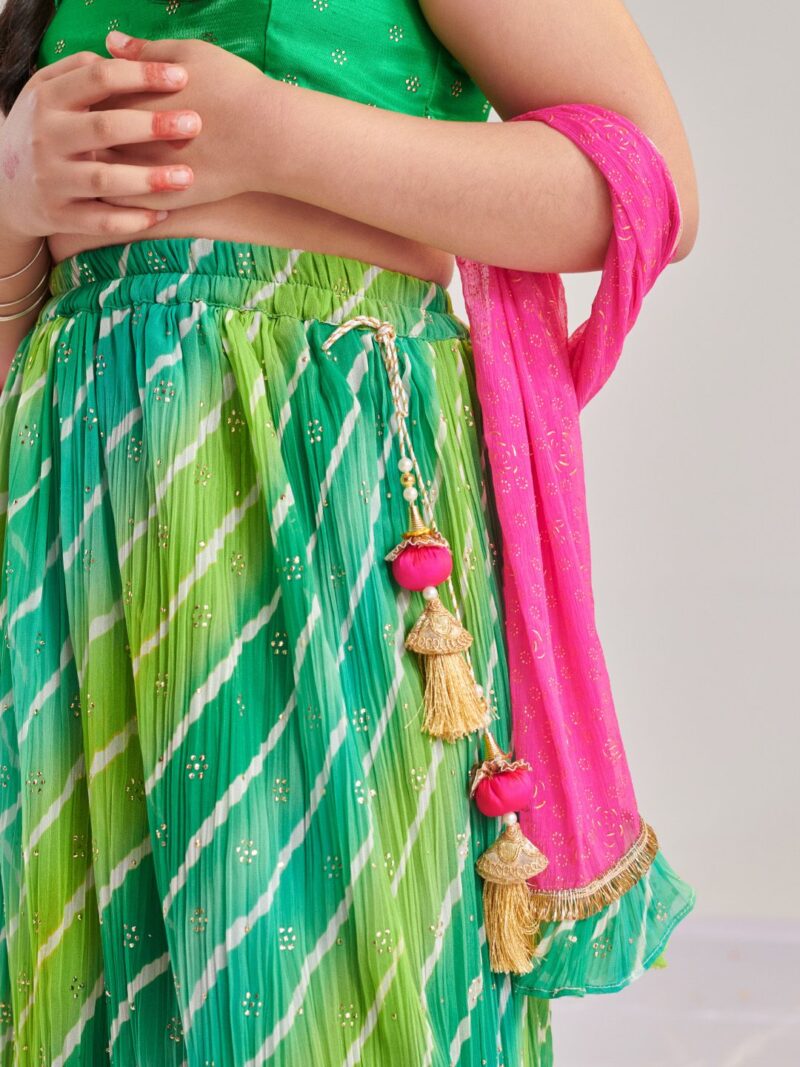 Green and pink printed ready to wear lehenga, has slip-on closure, flared hem