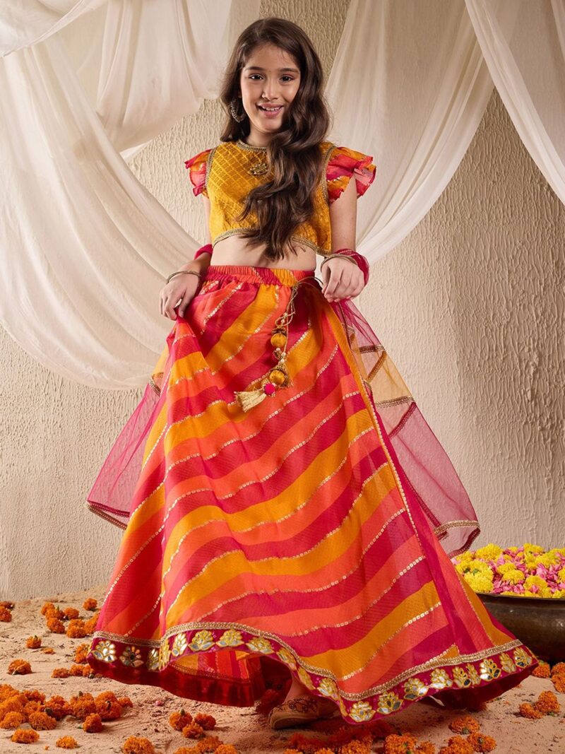 Red and orange, gold-toned woven design lehenga choli with dupatta, gotta patti