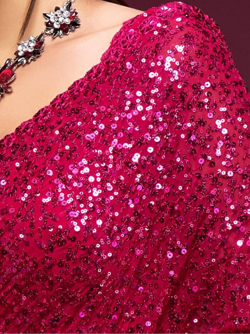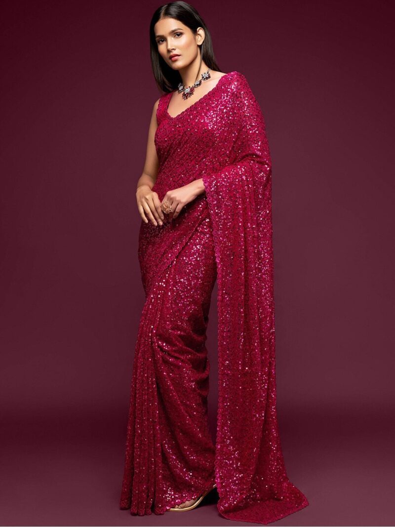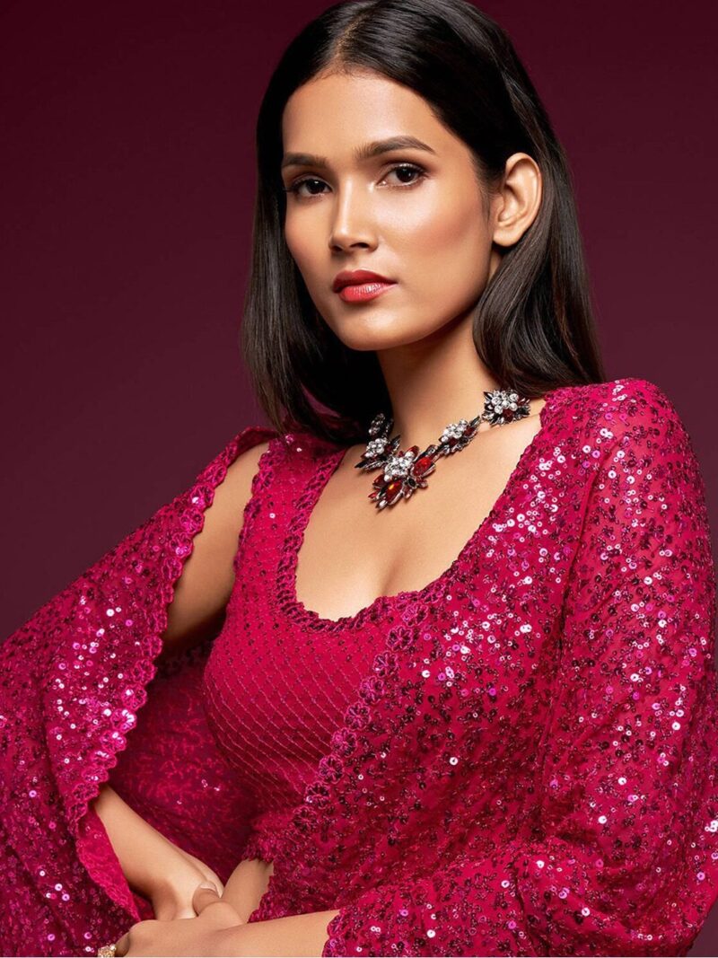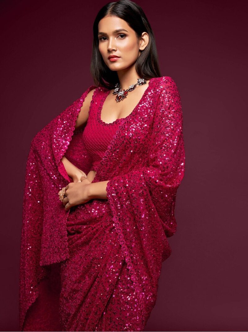 The blouse worn by the model might be for modelling purpose only. Check the image of the blouse piece to understand how the actual blouse piece looks like.