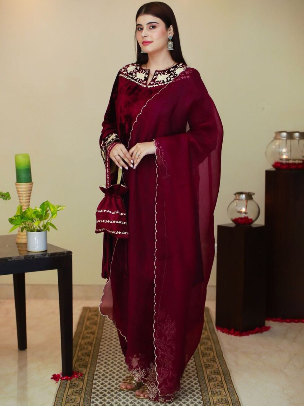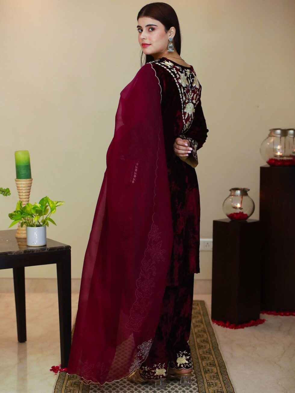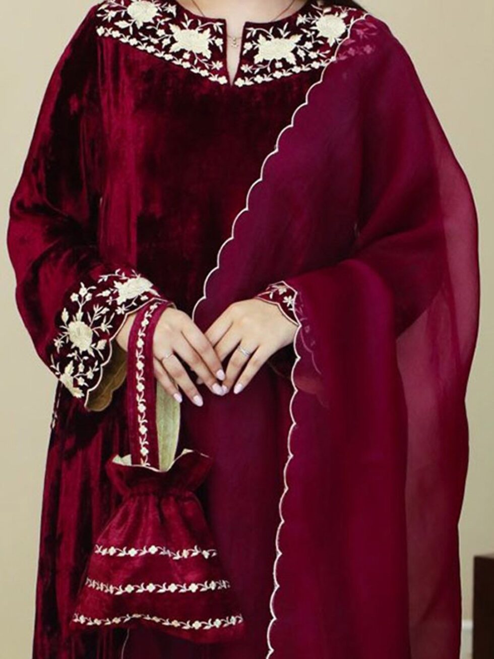 HOUSE OF INARI Floral Embroidered Thread Work Velvet Straight Kurta With Salwar & Dupatta