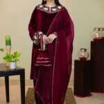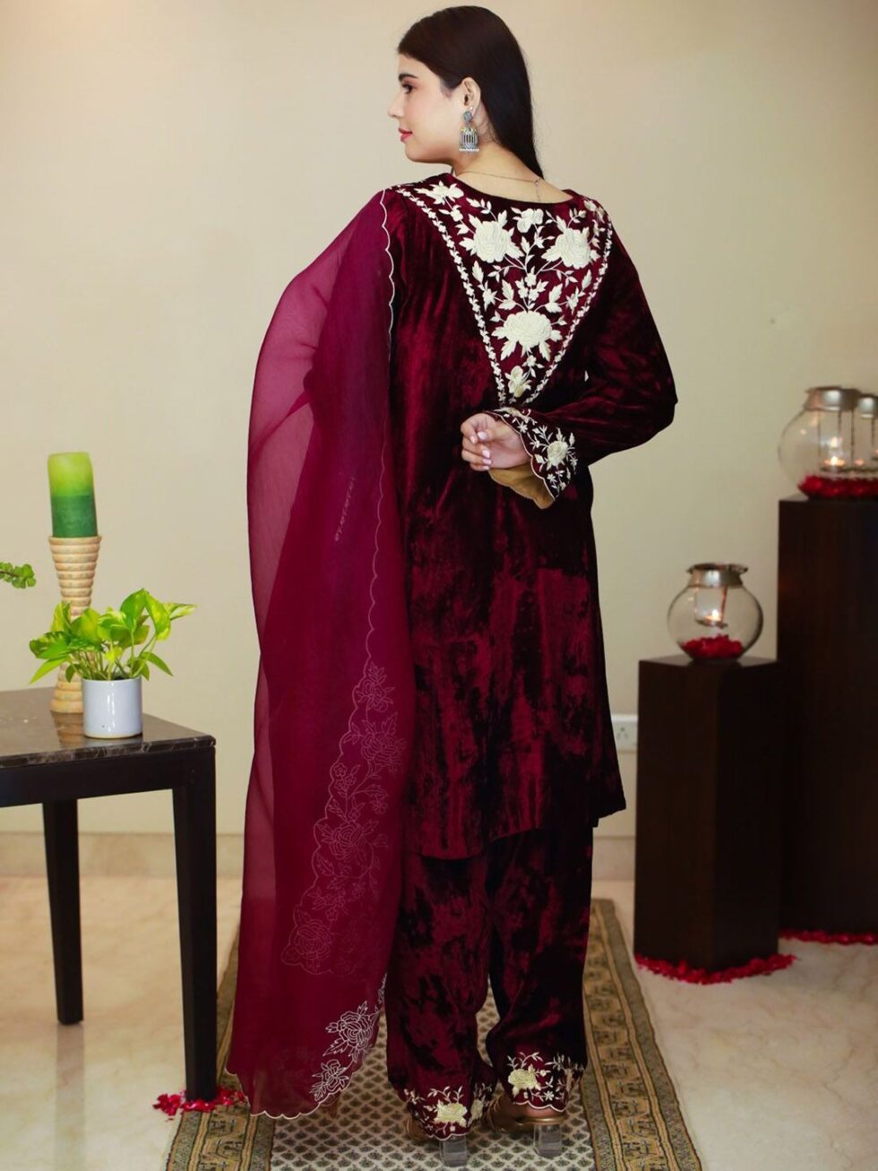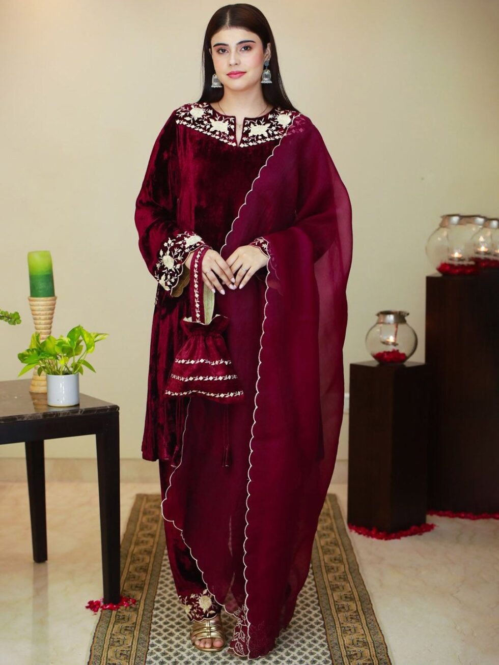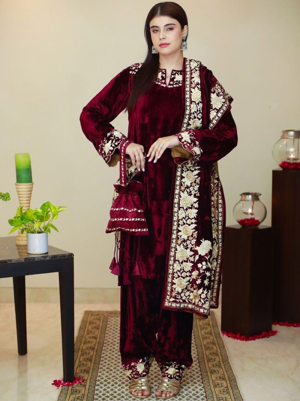 HOUSE OF INARI Floral Embroidered Thread Work Velvet Straight Kurta With Salwar & Dupatta