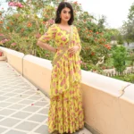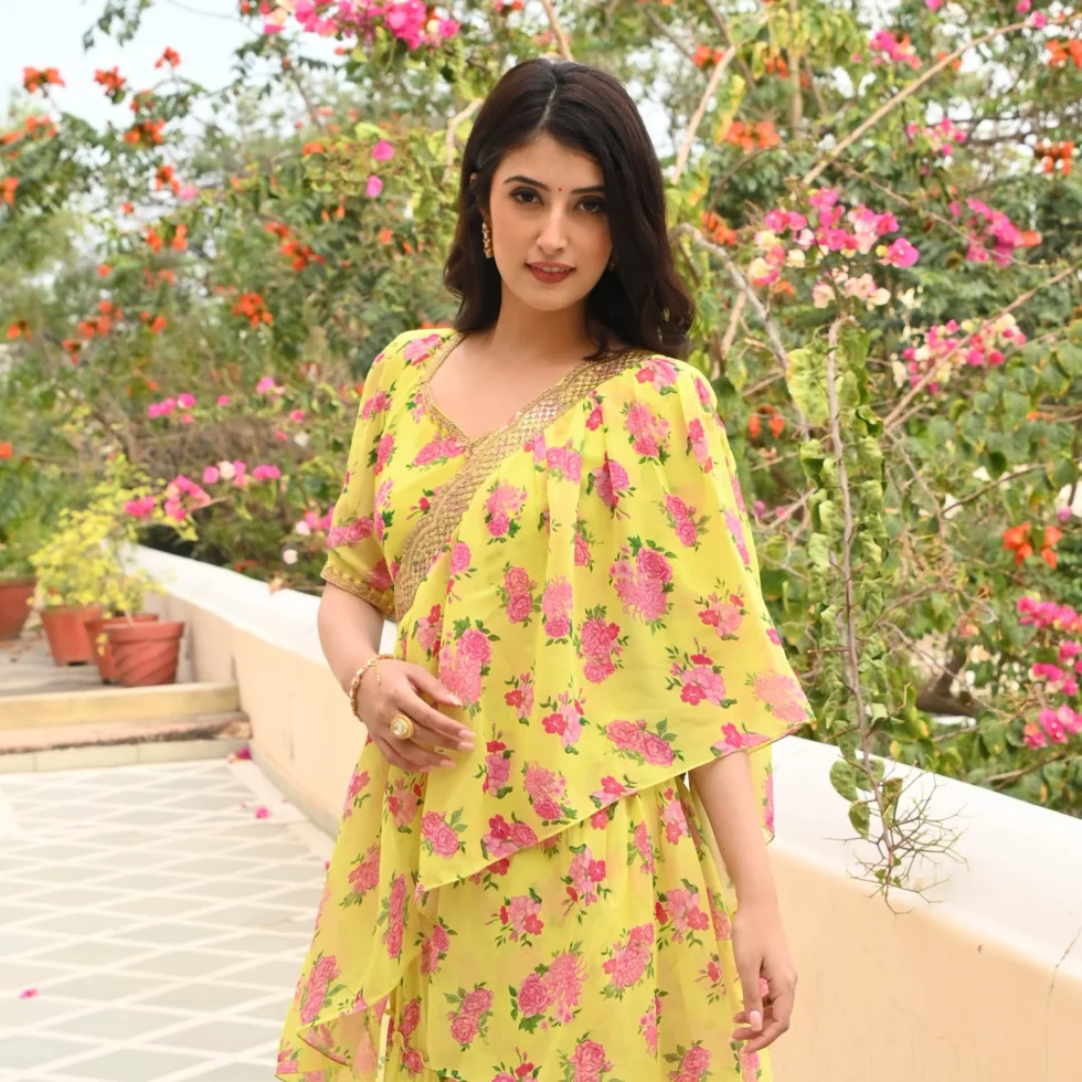 Get ready to turn heads in our Kusum Floral Draped Saree! This stunning Saree is the perfect blend of vibrant colours and delicate details that will make you feel like a true queen. This Saree is like a burst of sunshine on a dreary day, with its vibrant yellow colour and whimsical pink floral print. And the gotta border adds just the right touch of traditional elegance to make you feel like a true Indian beauty. The ruffles add a flirty and fun touch that’s perfect for twirling on the dance floor, while the blouse with a sweetheart neckline adds a touch of romance and femininity that’s hard to resist.