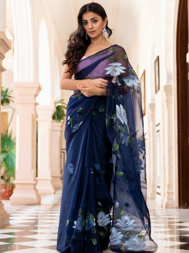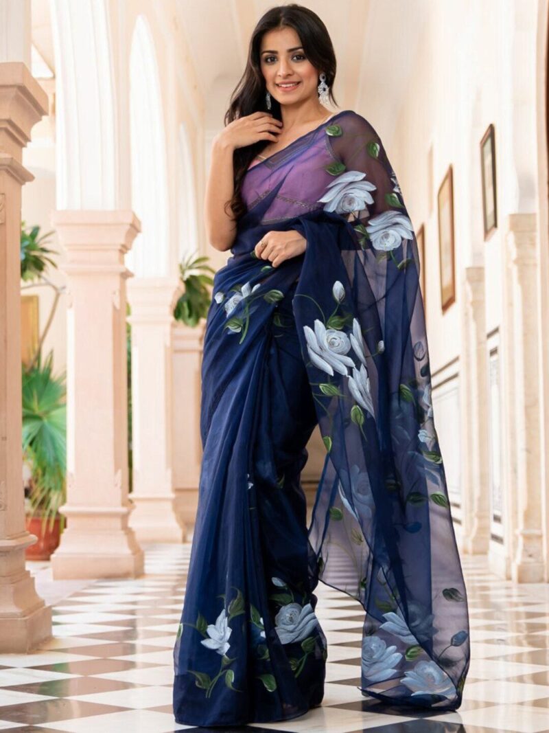 The blouse worn by the model might be for modelling purpose only. Check the image of the blouse piece to understand how the actual blouse piece looks like.