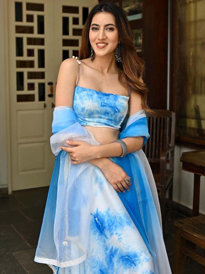 Blue and white dyed ready to wear blouse, has a square neck, sleeveless, blue and white dyed ready to wear lehenga, has zip closure, flared hem