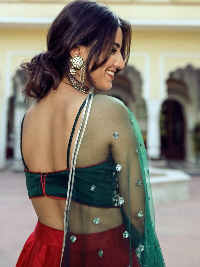 Green embellished ready to wear blouse, has a scoop neck, sleeveless,