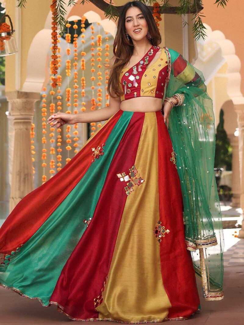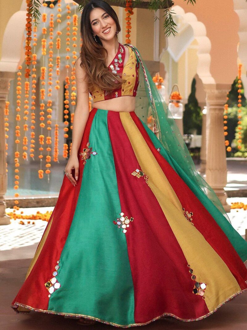 Red and green embellished lehenga choli with dupatta, thread work with ready to wear blouse, has a one shoulder, sleeveless, zip closure