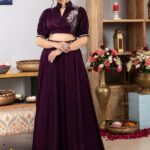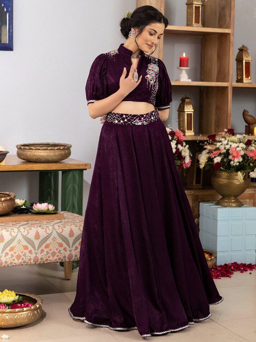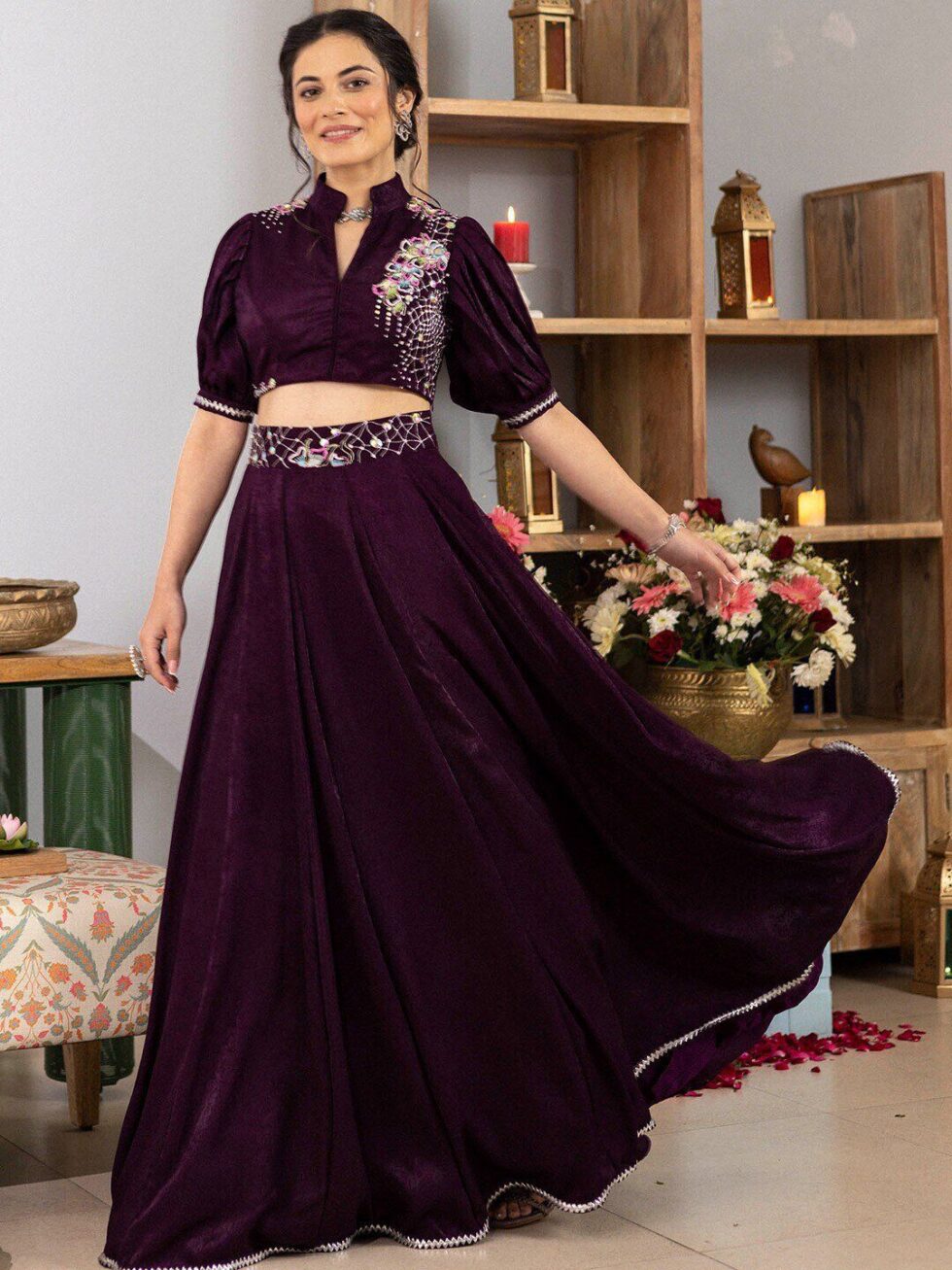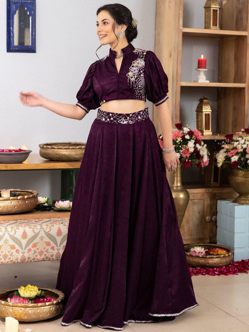 Purple solid ready to wear lehenga, has zip closure, flared hem