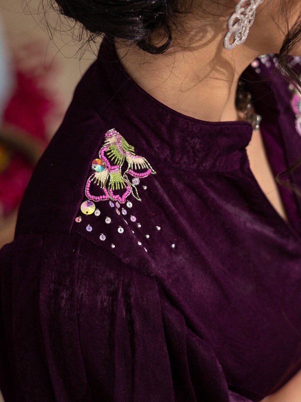 Purple embroidered ready to wear blouse, has a mandarin collar, short sleeves, zip closure