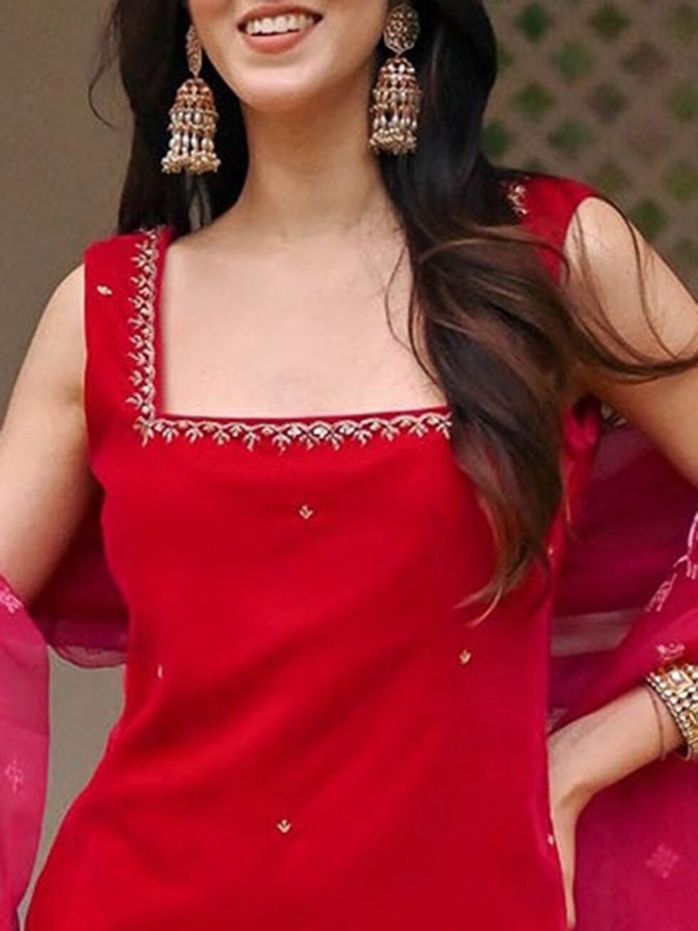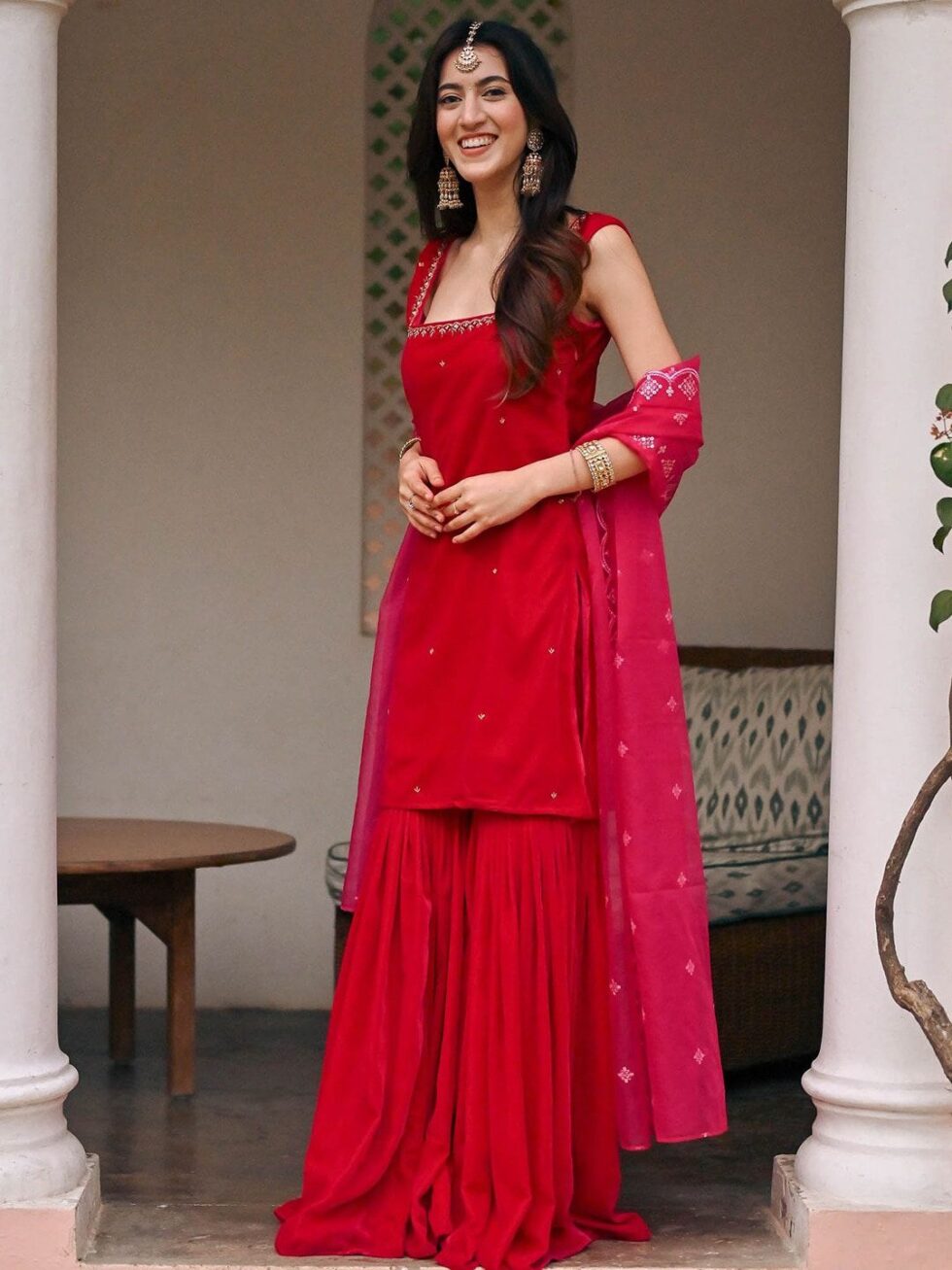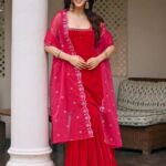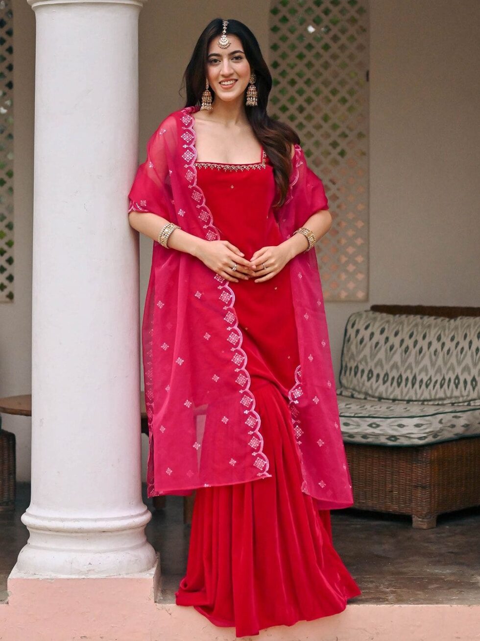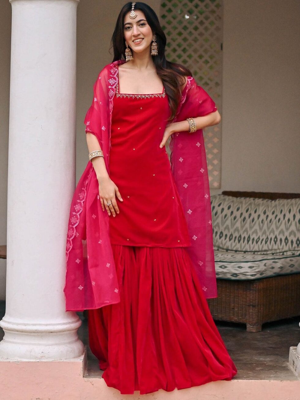 Lavanya The Label Ethnic Motifs Embroidered Regular Velvet Kurta with Sharara & Dupatta