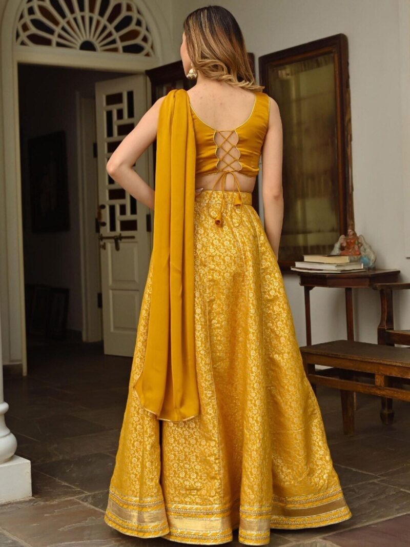 Gold-toned and yellow solid ready to wear blouse, has a round neck, sleeveless, gold-toned and yellow woven design ready to wear lehenga, has zip closure, flared hem