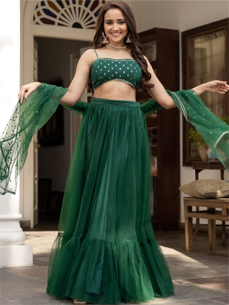 Green and gold-toned embroidered lehenga choli with dupatta,