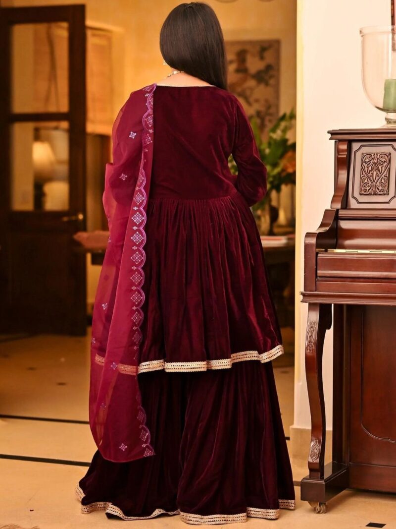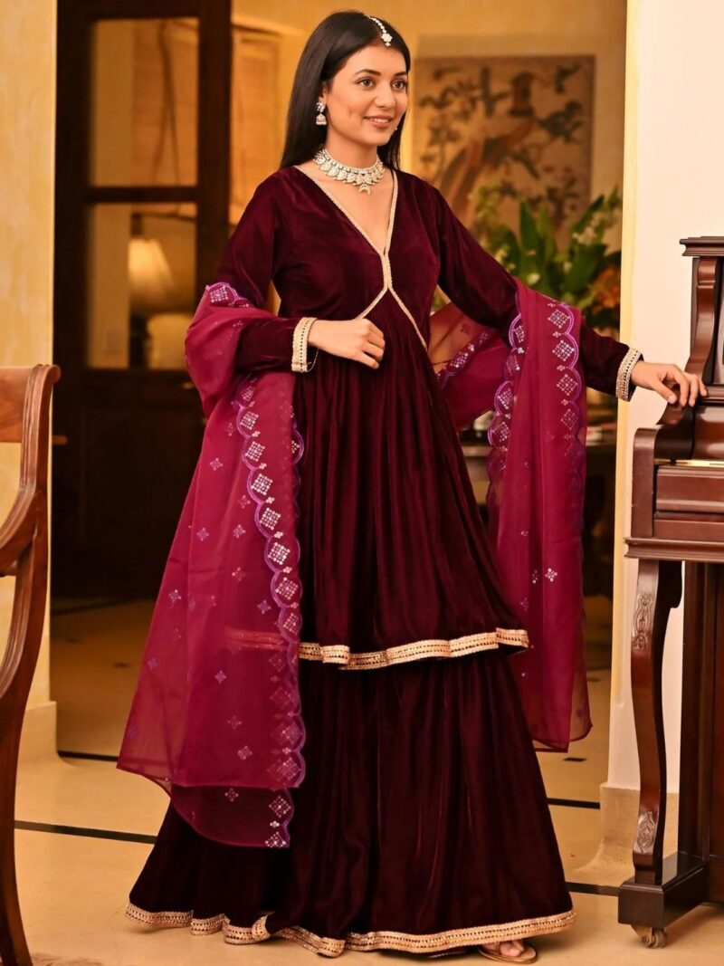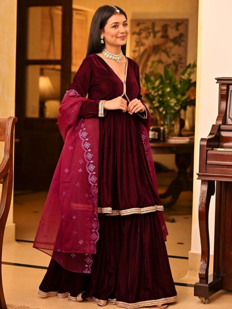 Indulge in opulence with our Magenta Velvet Sharara Set ? a mesmerizing blend of rich magenta velvet adorned with intricate embellishments. This ensemble effortlessly combines traditional charm with contemporary flair, ensuring you stand out with elegance and allure at any special occasion. Embrace the allure of magenta, and let this velvet sharara set be your statement of style and sophistication.