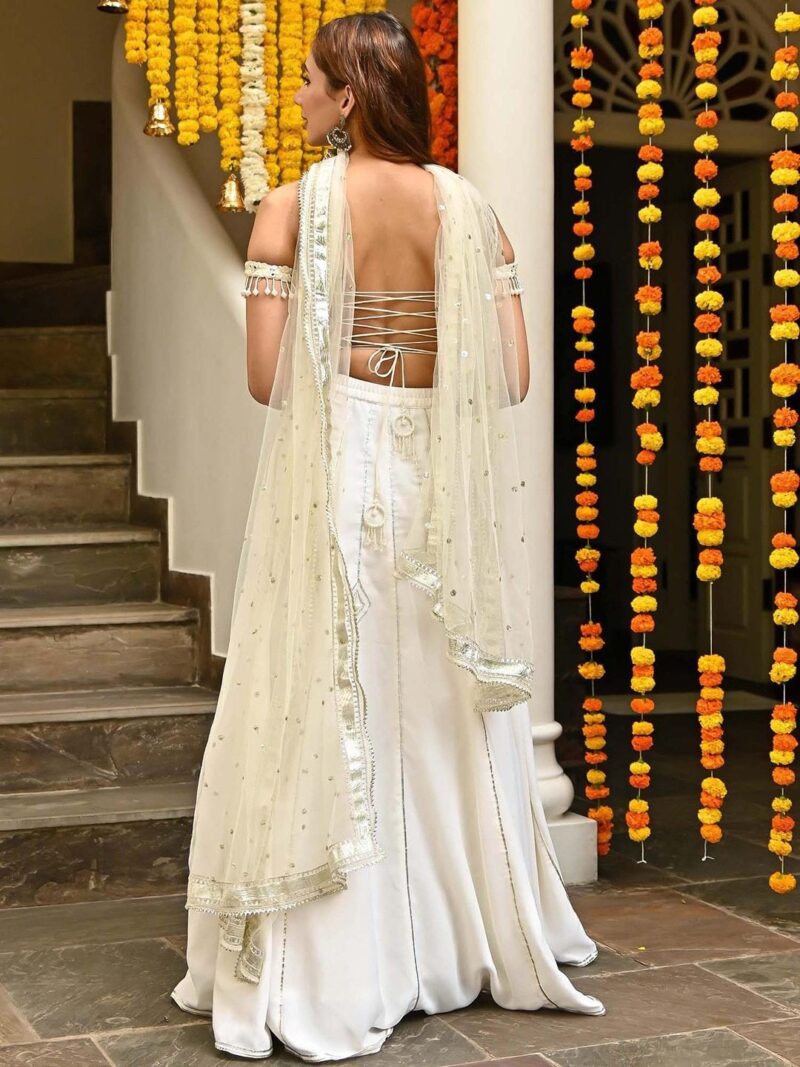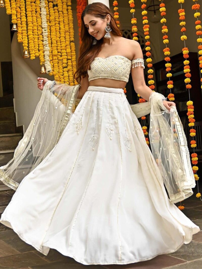 Off white and gold-toned embellished lehenga choli with dupatta, mirror work
