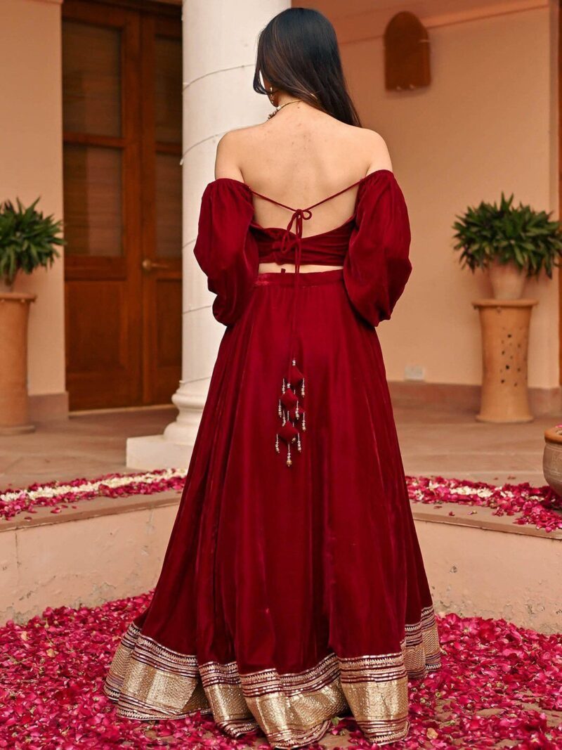 Maroon and gold-toned solid ready to wear blouse, has a off-shoulder, long sleeves, maroon and gold-toned solid ready to wear lehenga, has zip closure, flared hem