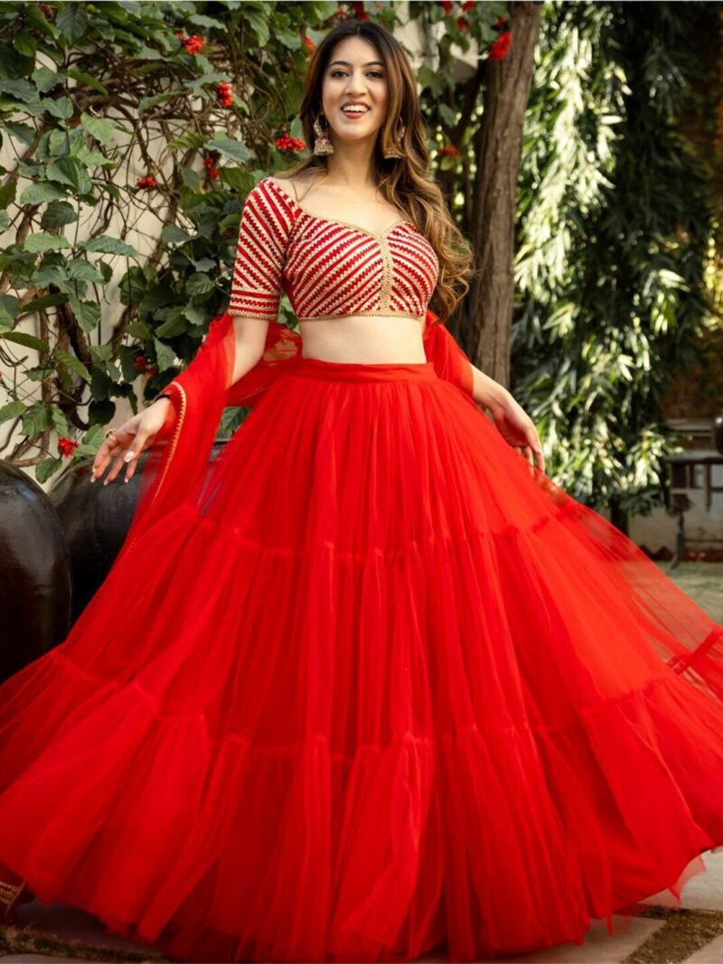 Red and gold-toned solid ready to wear lehenga, has zip closure, flared hem