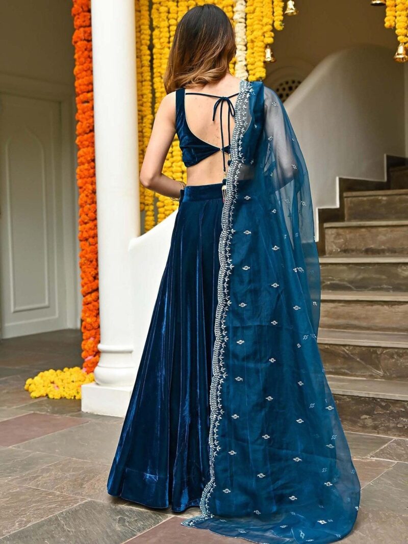 Teal and gold-toned embellished ready to wear blouse, sleeveless, teal and gold-toned solid ready to wear lehenga, has zip closure, flared hem