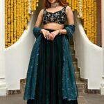 Teal and gold-toned embellished lehenga choli with dupatta, zardozi