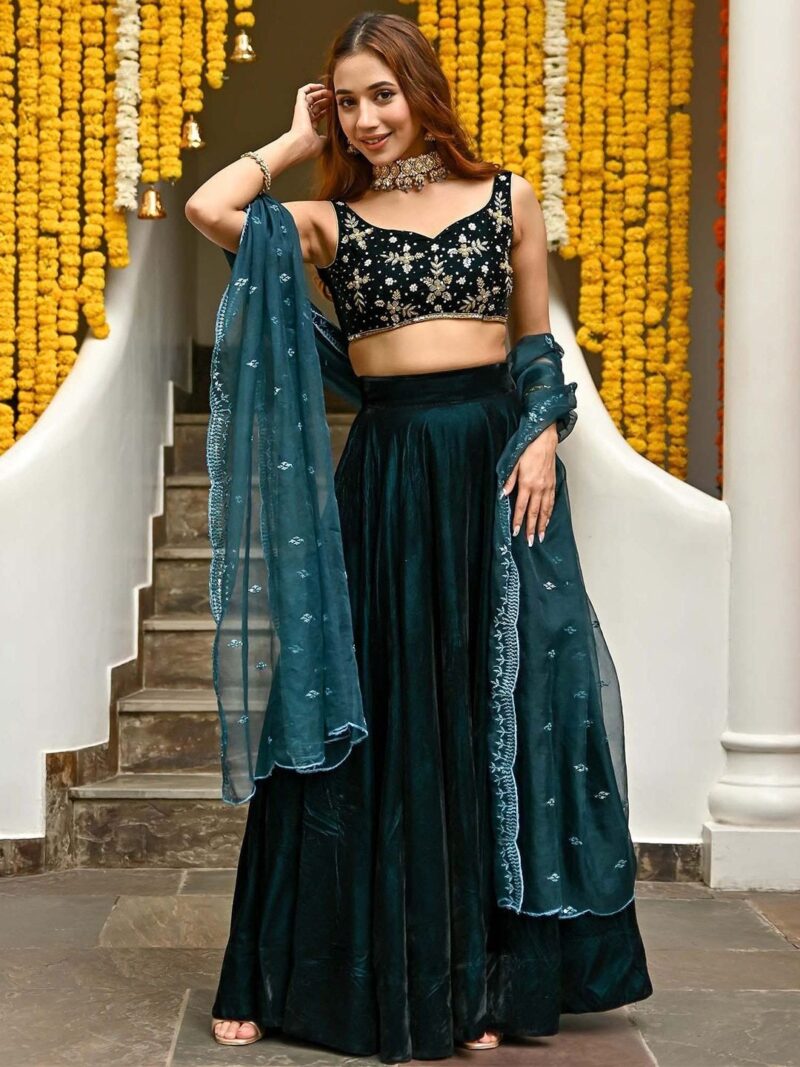 Teal and gold-toned embellished ready to wear blouse, has a v-neck, sleeveless, teal and gold-toned solid ready to wear lehenga, has zip closure, flared hem